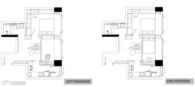这套小户型装修最大的亮点,莫过于空间重叠利用,可变性带来了最大的包容度。客厅除了满足日常会客、居家办公外,还多了一个客房的功能,将空间利用最大化。墙壁折叠床设计非常的巧妙,开合之间满足了不同的使用场景。