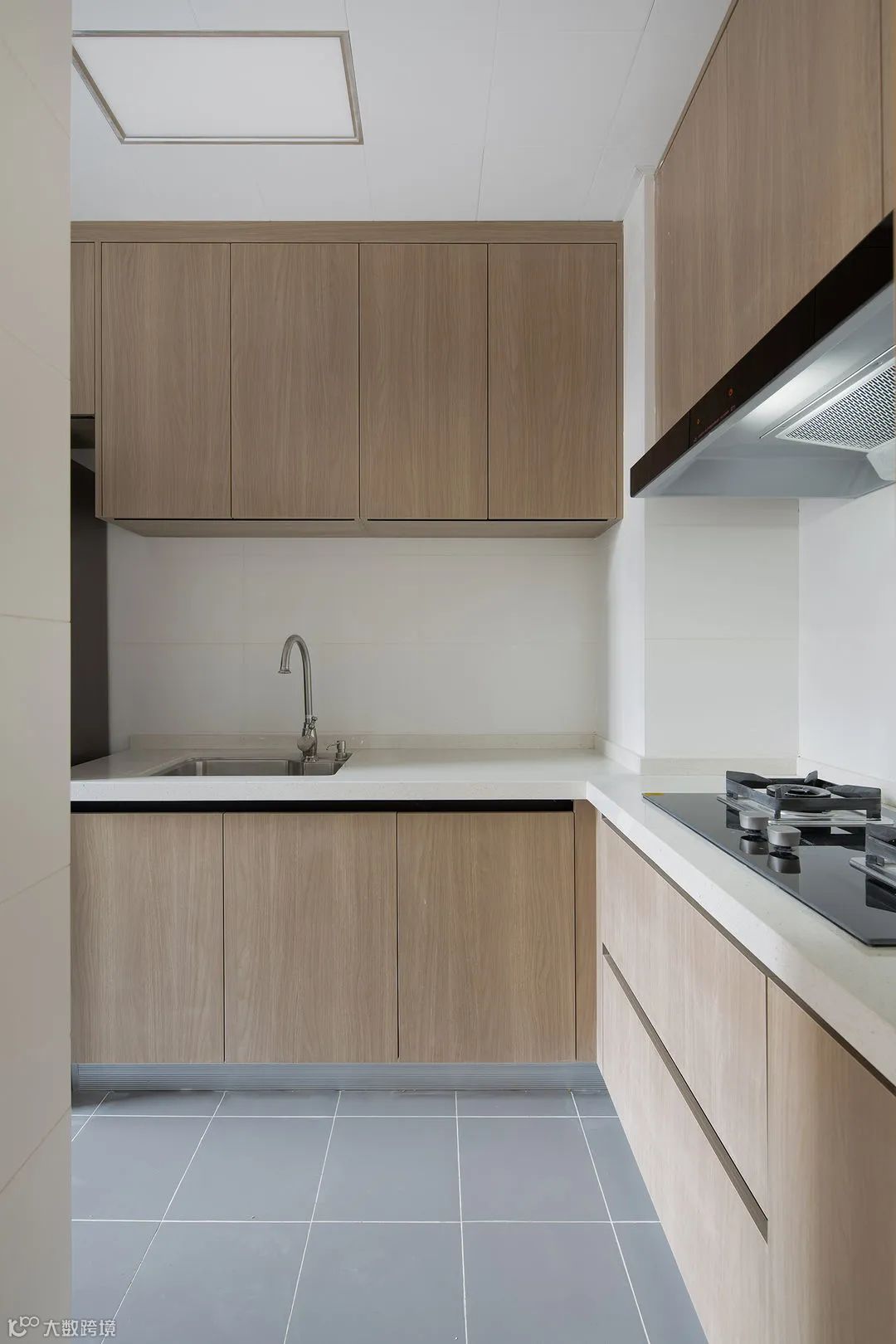 小户型厨房,不比大户型那么开阔大气,装修尽可能考虑到备餐合理性。L型的厨房设计,让洗、切、炒动线更流畅,整体便利且安全。木质橱柜搭配白色石英石台面,加上橱柜吊柜无门把手设计,整体视感更加自然整洁。