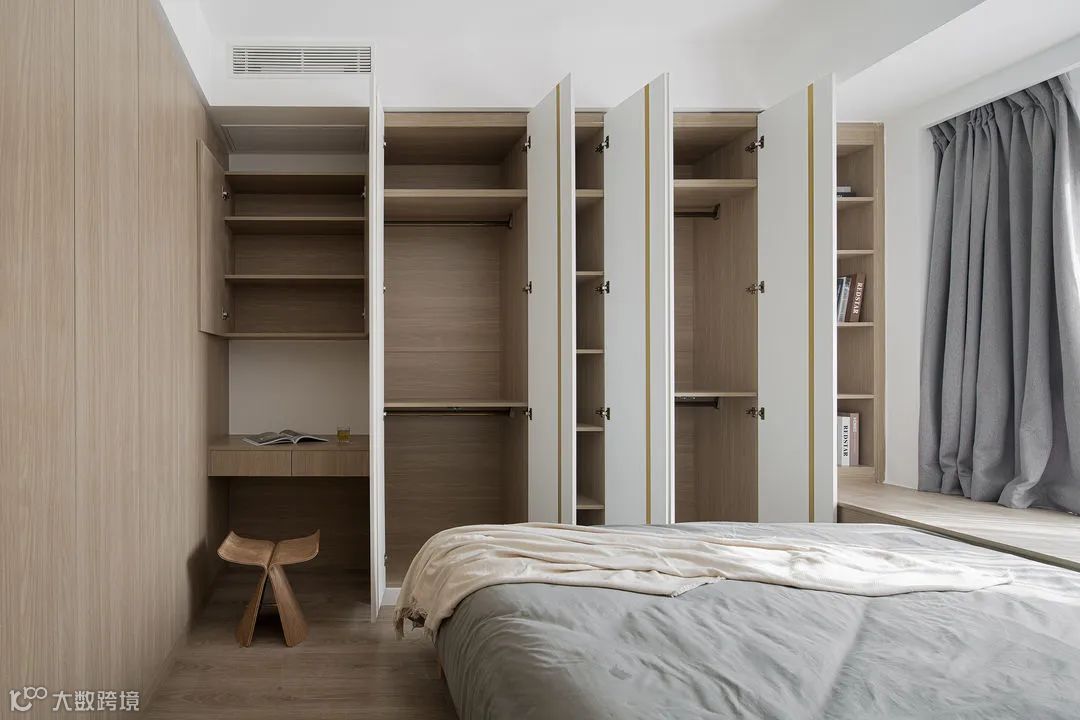 功能上,L型大面积储物柜设计,为主卧提供了足够多的储物空间,并且储物柜内部也都进行了合理的划分,以满足屋主对不同物品的收纳。