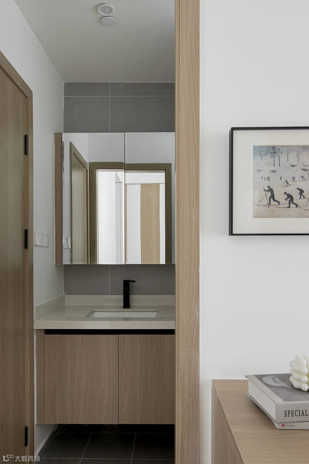在印象中,大部分小户型卫生间都采用一体布局,不仅空间拥挤,日常生活也多有不便。而分离式卫生间设计,却很好地解决了卫生间一体布局的不足。盥洗台放置在过道,储物柜和镜柜结合,让收纳变得更简单。
