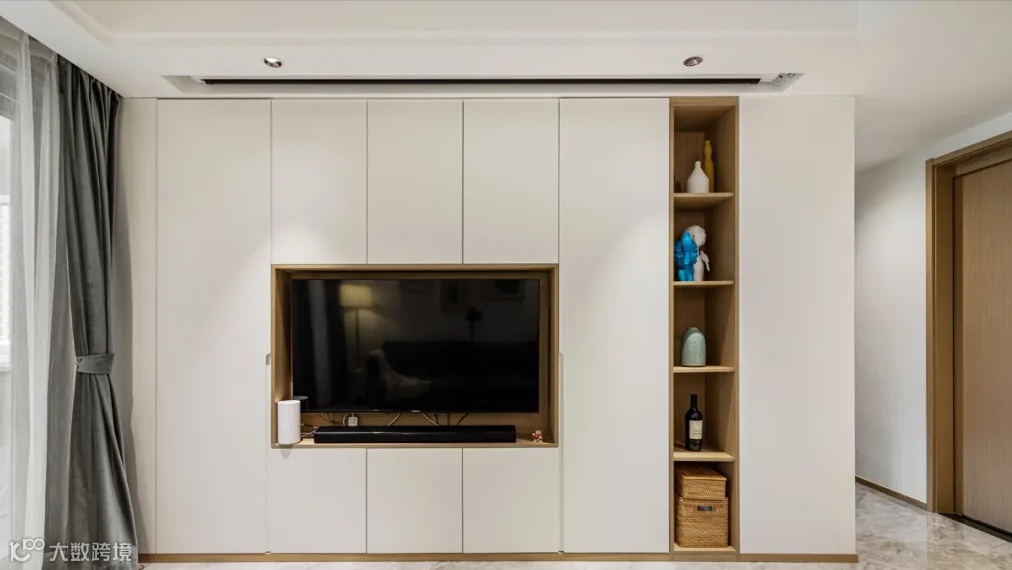 电视机采用嵌入式设计,一整墙的柜子,既不占用额外空间,观看距离也更加合适。