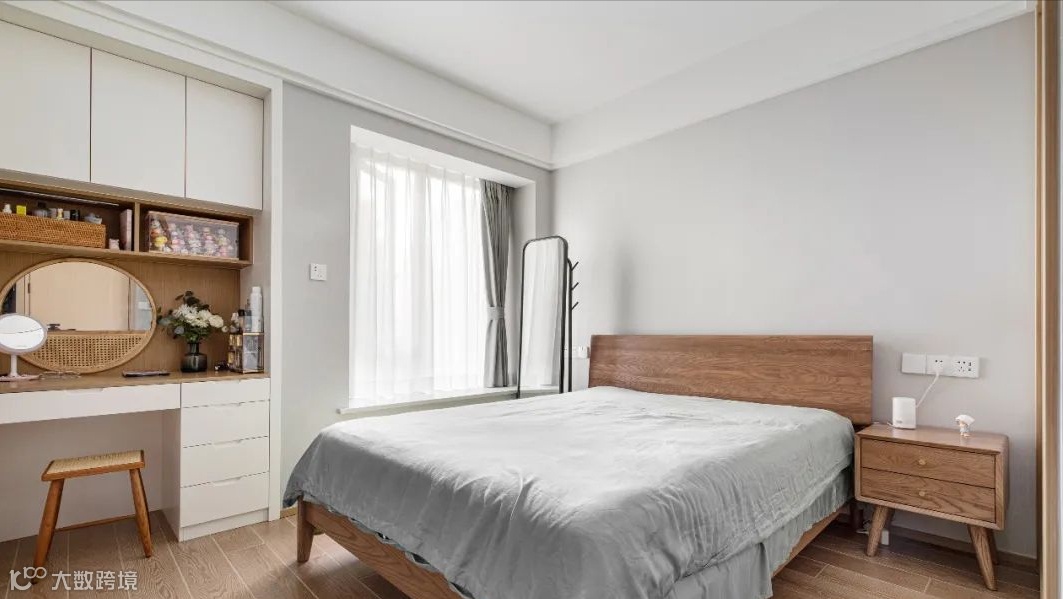 主卧以白色调为主,搭配原木家居,温馨又耐看。飘窗提供大量采光,临窗设计全身镜,方便整理着装。