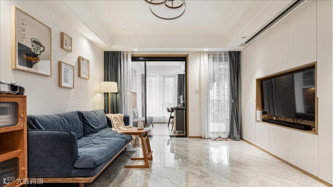 客厅和阳台书房采用玻璃隔断,三联动玻璃门,大大引入自然采光,空间通透明亮。