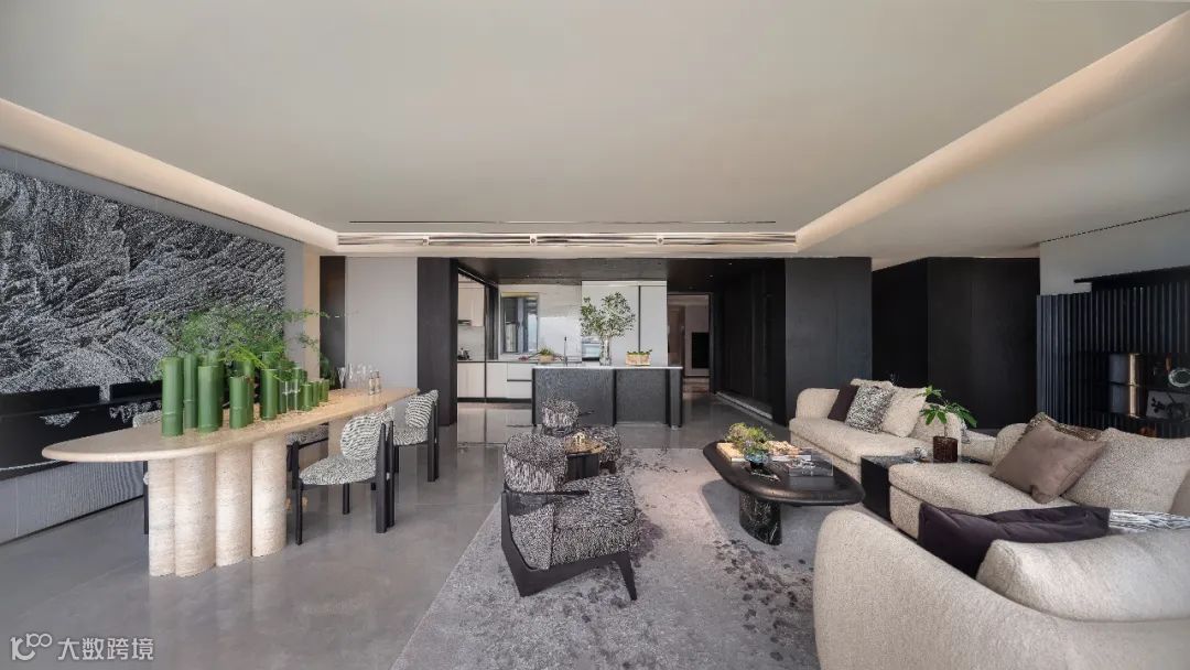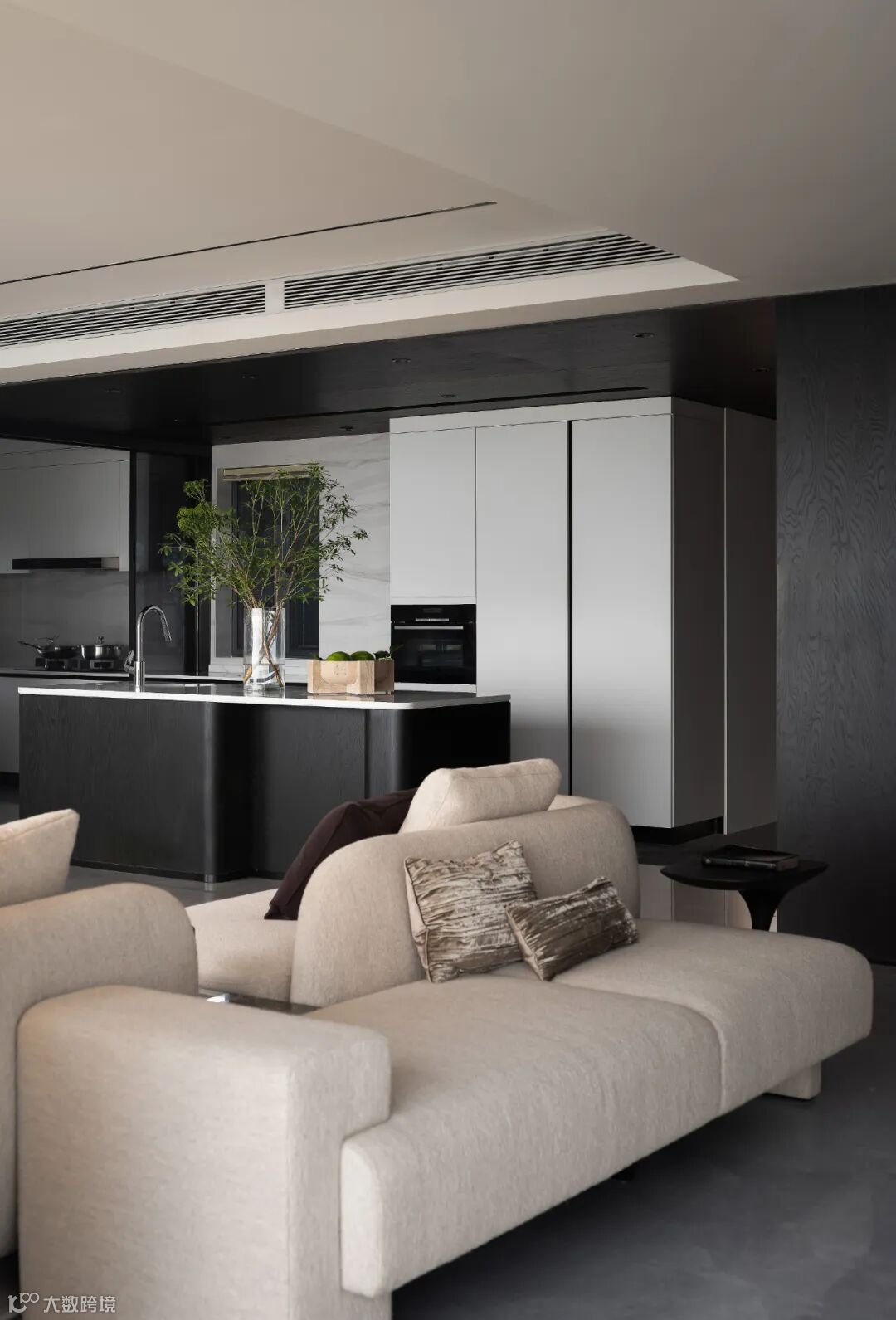 利落的线条与温润的陈设意趣相称,客餐厅与厨房以无缝拼接大规格岩板通铺地面,增加了空间的完整性。