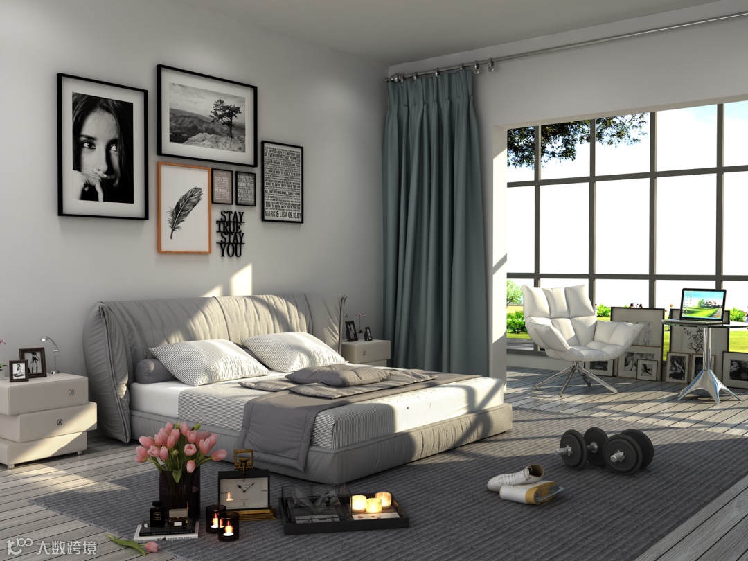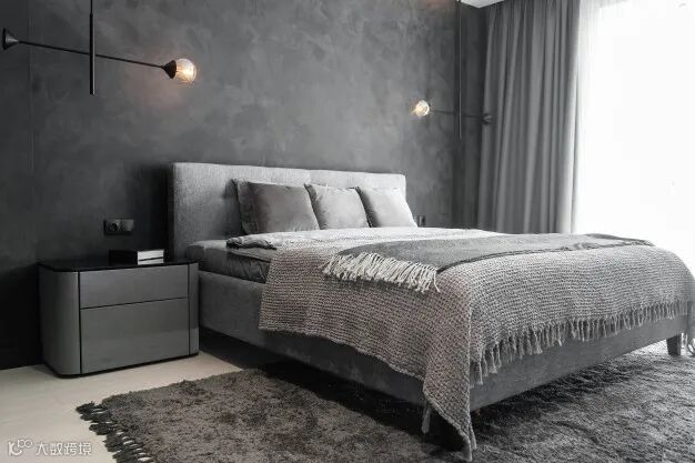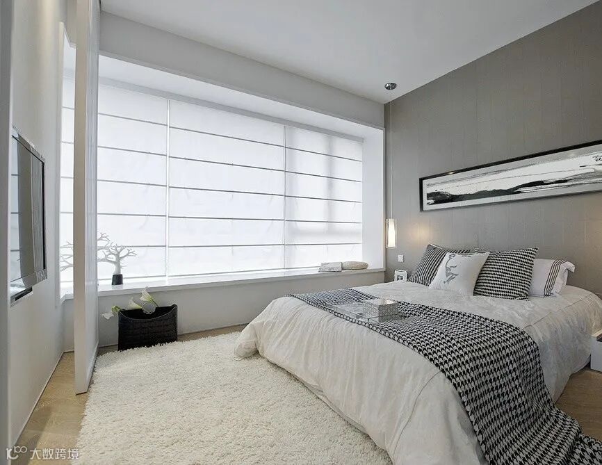 黑白色叠搭的床品、装饰画突出高级感,非常耐看。