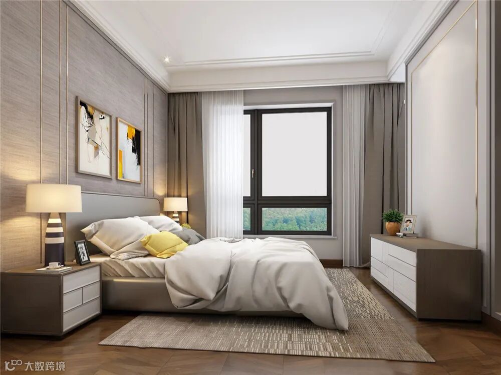60%的背景色占到视觉一半以上的空间,在卧室中,主要可以在墙面、天花板、主床品等体现,这为卧室调性打下基础。