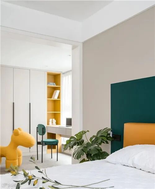 在色相环上相隔超过 120° 的颜色被称为对比色,视觉冲击力强;而相隔 180° 的互补色,如红与绿、黄与紫,更是完美地统一冲突与和谐。用对比色、互补色搭配搭配卧室,艺术而富有美感。