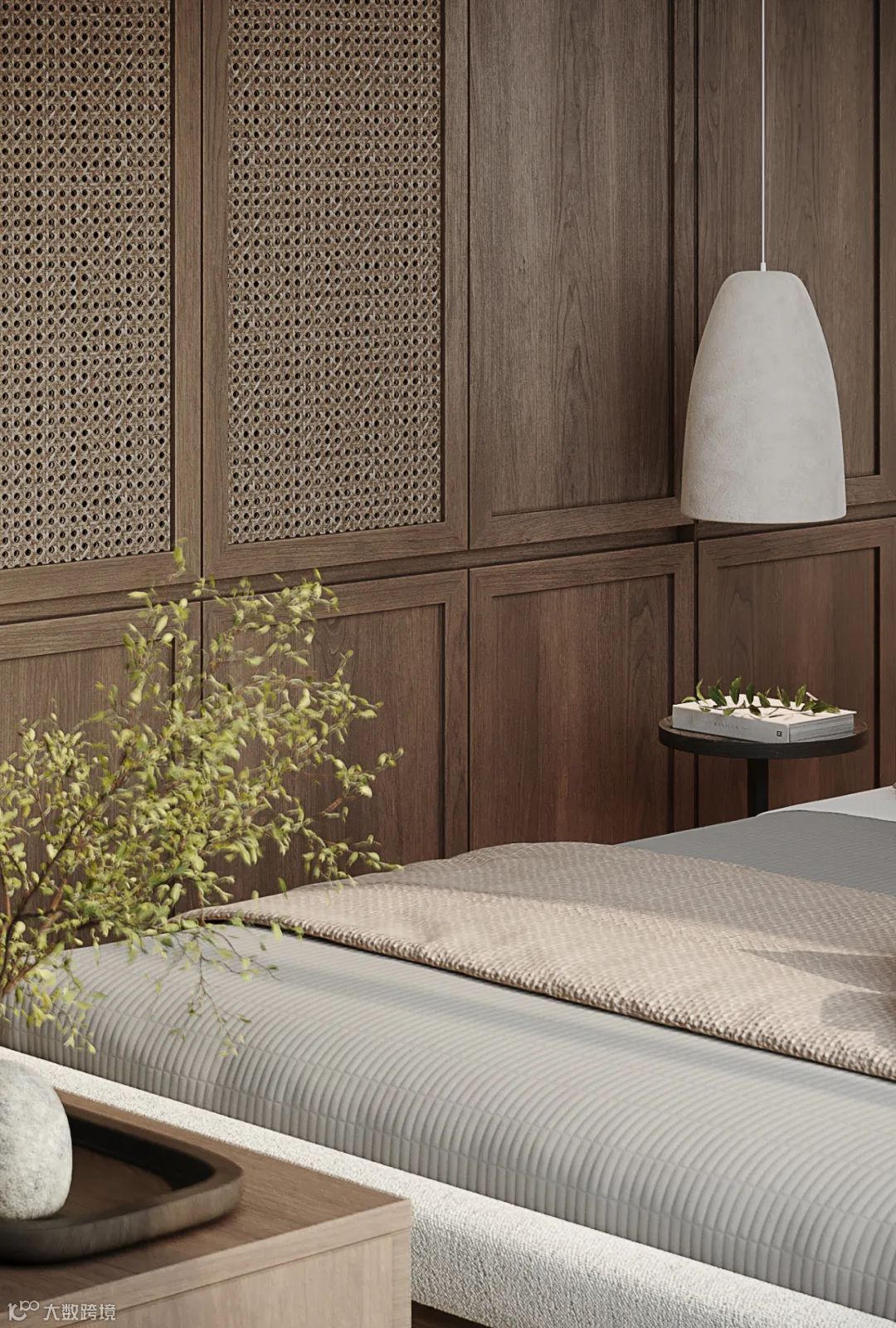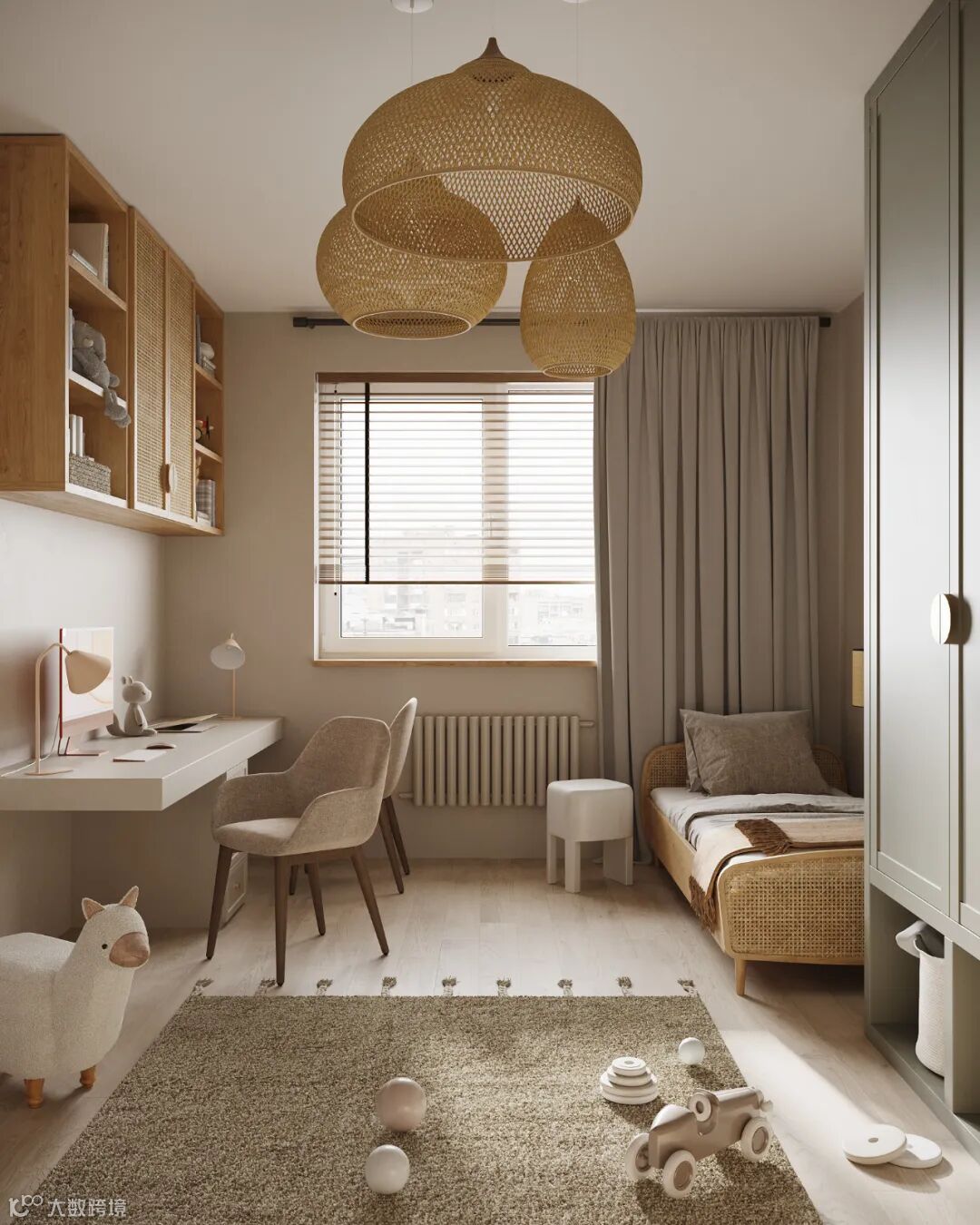 9、地毯和窗帘:优先选择卡其色、太妃糖色、奶油色,切勿选择拼色、杂色以及冷色。木质百叶帘是很好的选择。挂画应挑选低饱和度的抽象画,花盆采用复古的陶盆或者竹编花篮,同时再点缀以藤编元素。