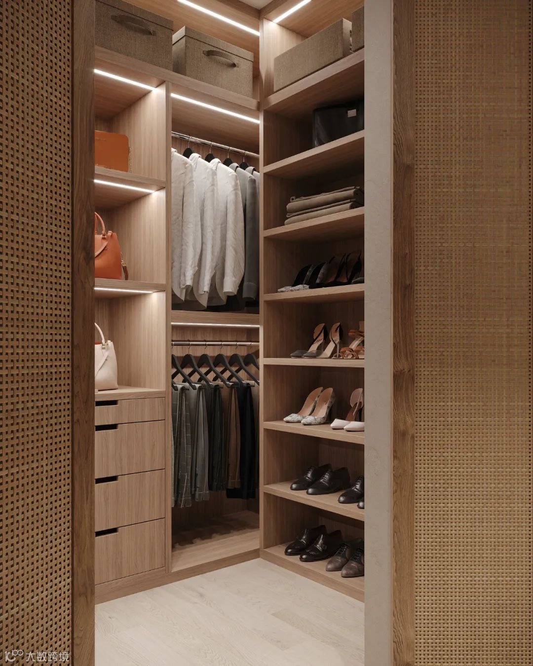 6、定制柜:奶油色、胡桃色和柚木色都是非常适合的选择,而不同类型的柜门搭配小圆拉手也能为空间增添精致感。柜门可以做成简框门、十字骨骼线门、藤编柜门、粗麻布艺门,搭配小圆拉手来增加精致感。
