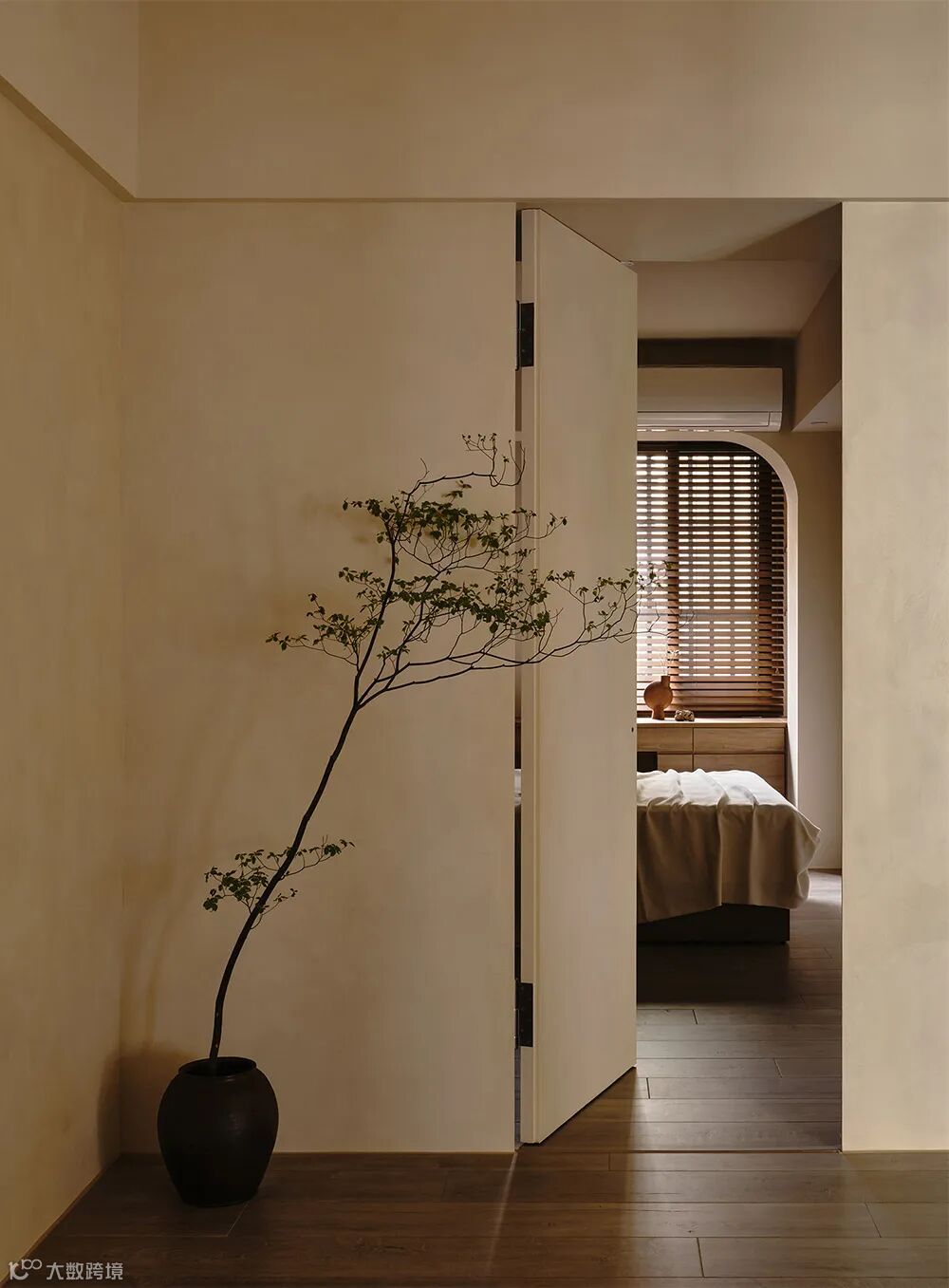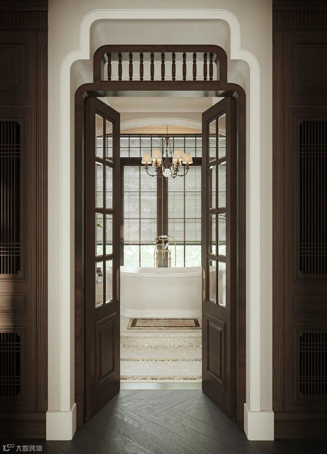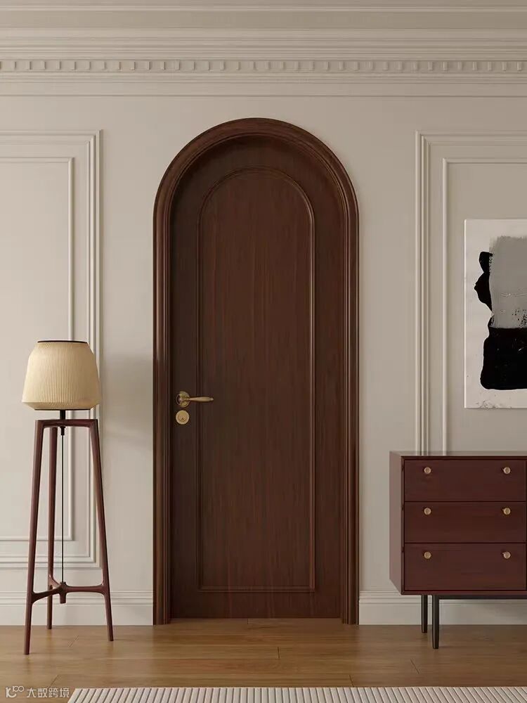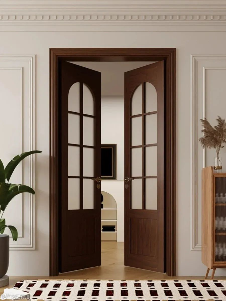 4、木门:中古风装修中,选择墙面同色系且带精致线条的门型能够为空间增添独特的魅力。房门可做圆弧门造型,来衬托空间的柔美气质,有条件的可以做对开门。