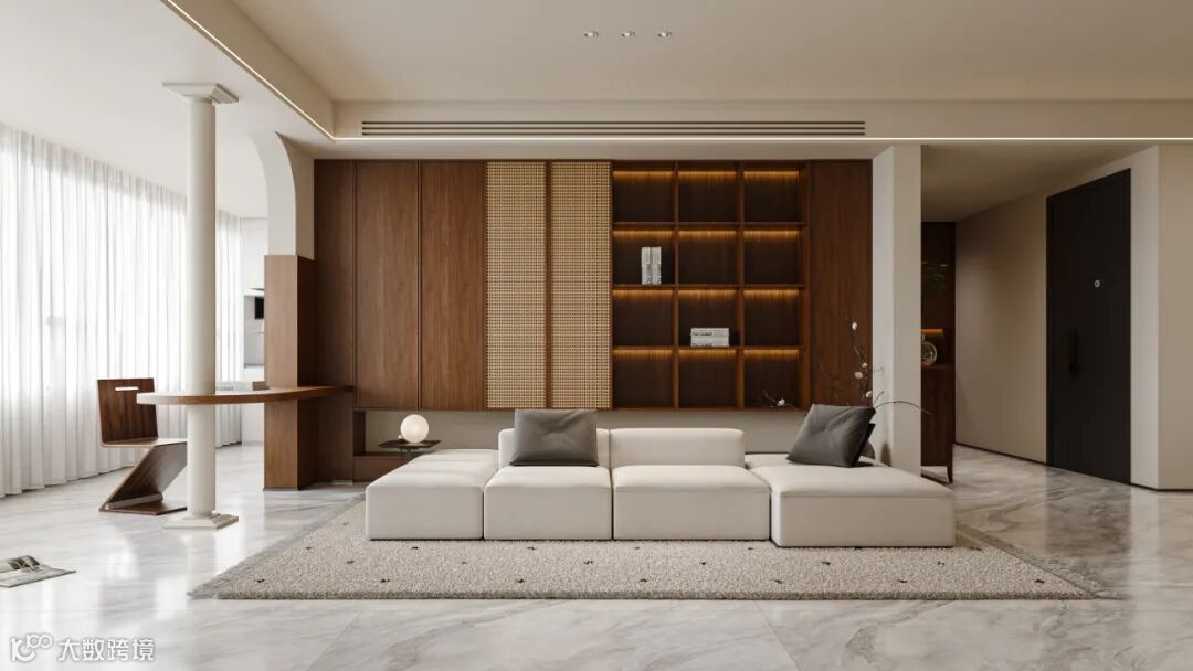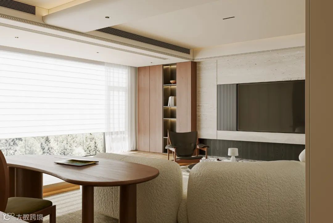 7、成品家具:选择柚木色或胡桃色,色彩避免完全一致,以防过于呆板,颜色深浅有所变化可增添空间层次感。造型力求简约,实现天然传统材料与现代材料相结合,融合抽象几何体块与有机曲线,家具具备精致线条感。