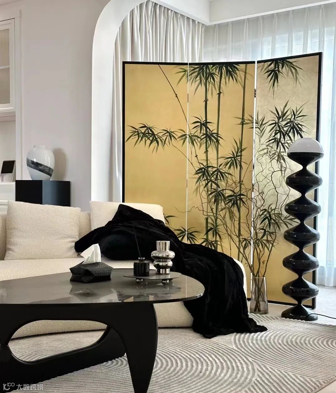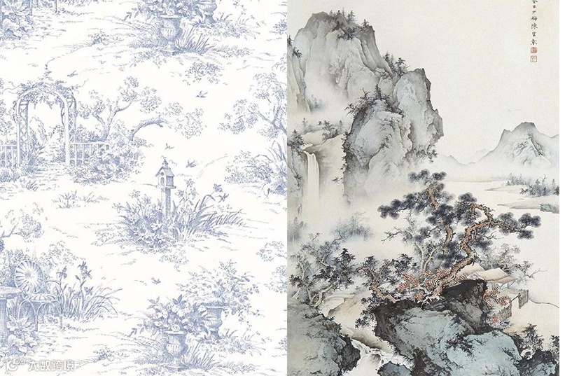 进入新法式风格扑面而来的清冷浪漫感,主要就是来源自东方纹样装饰元素,大多出现在墙纸、挂画、屏风上。带有花鸟鱼虫、山水 、人物式样。