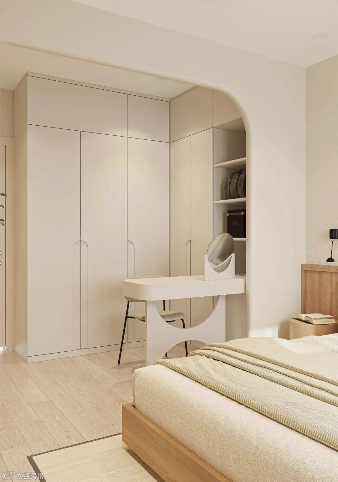 一体式衣柜实现了衣柜的多功能性,将衣柜、收纳柜、书桌等功能融为一体,让空间更显轻便舒缓,一体式的衣柜梳妆台,也节约了更多的空间,同时提升整体卧室空间的利用率,同时节省梳妆台等额外的开销。