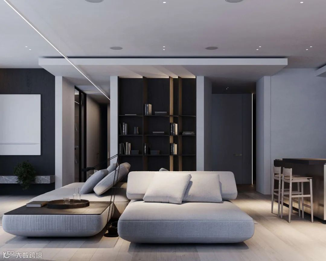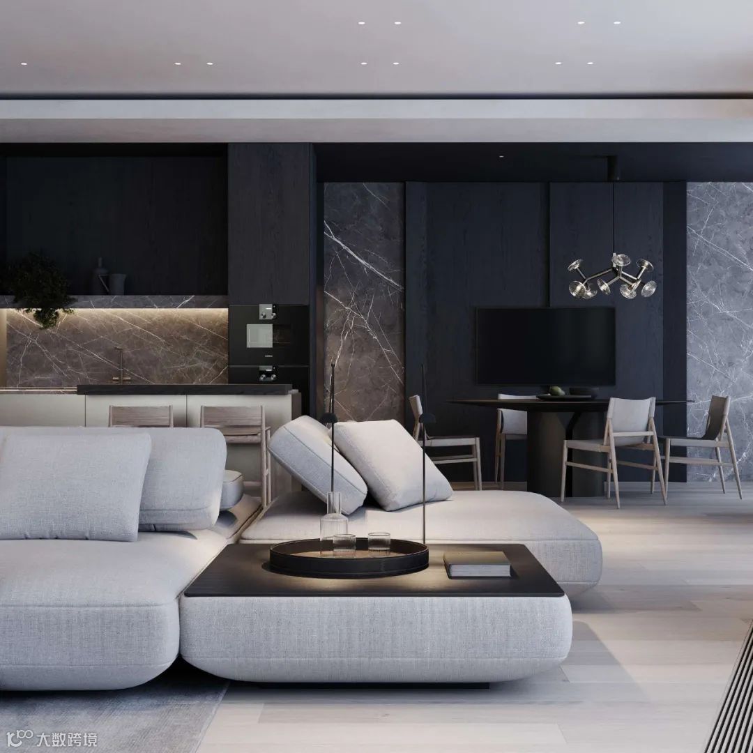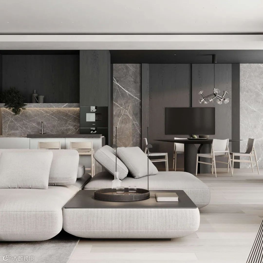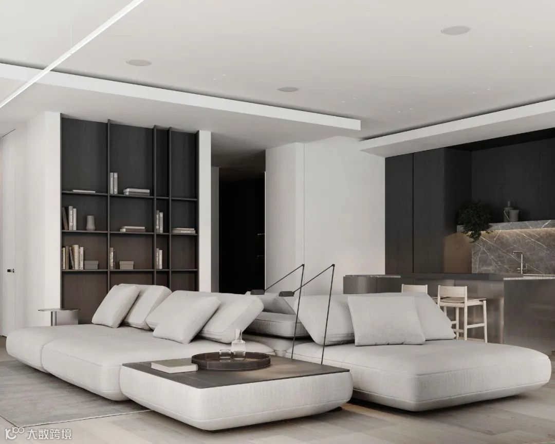 Babayants布艺沙发极具质感,空间的深浅色系之间衔接自如,增添视觉层次。体块与材质变化应对空间的功能划分,彰显几何秩序之美。