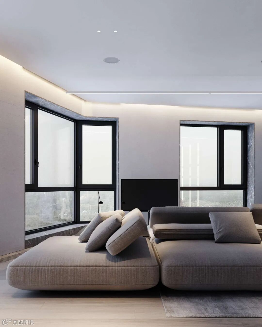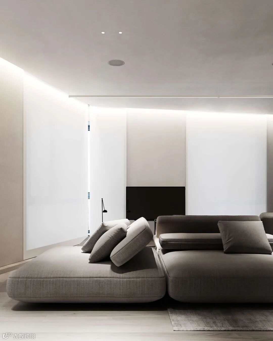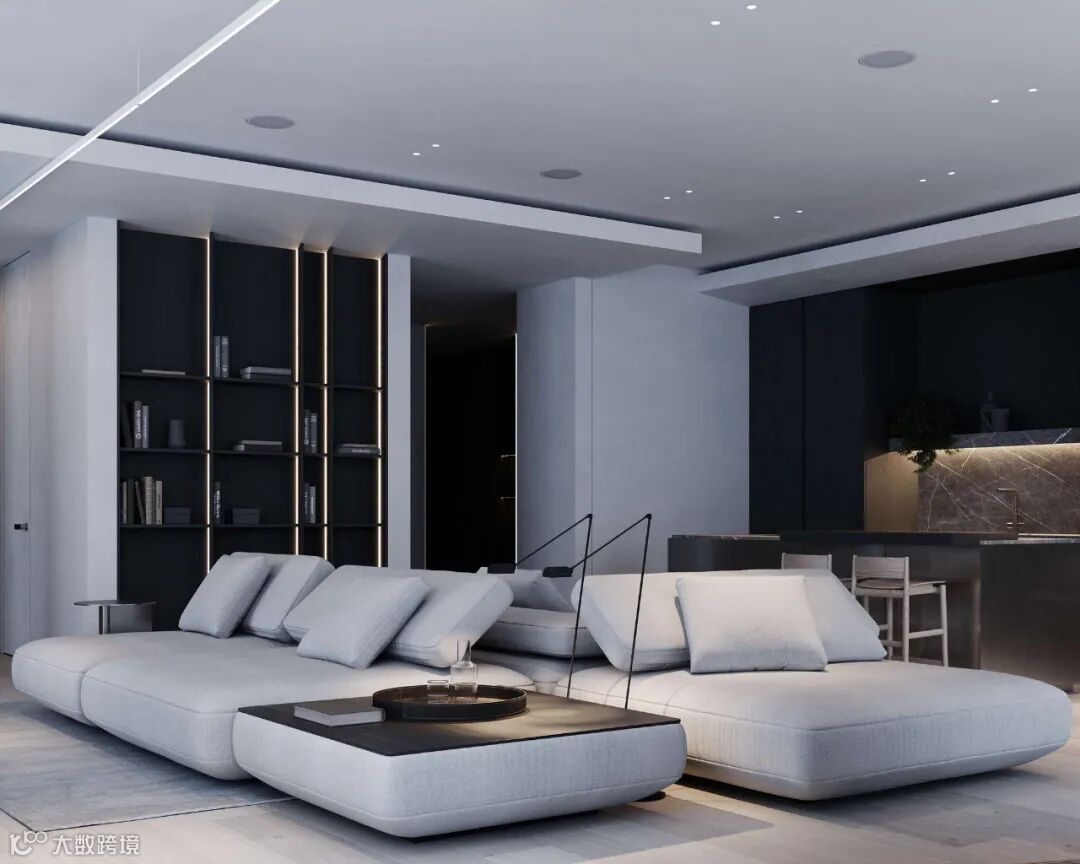 Babayants布艺沙发极具质感,空间的深浅色系之间衔接自如,增添视觉层次。体块与材质变化应对空间的功能划分,彰显几何秩序之美。