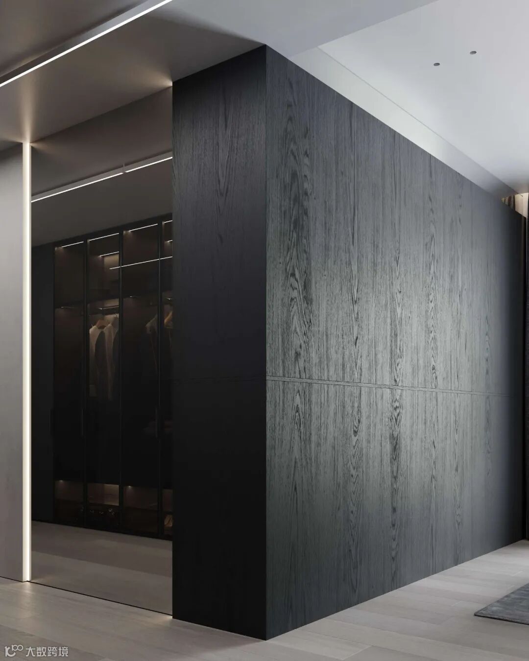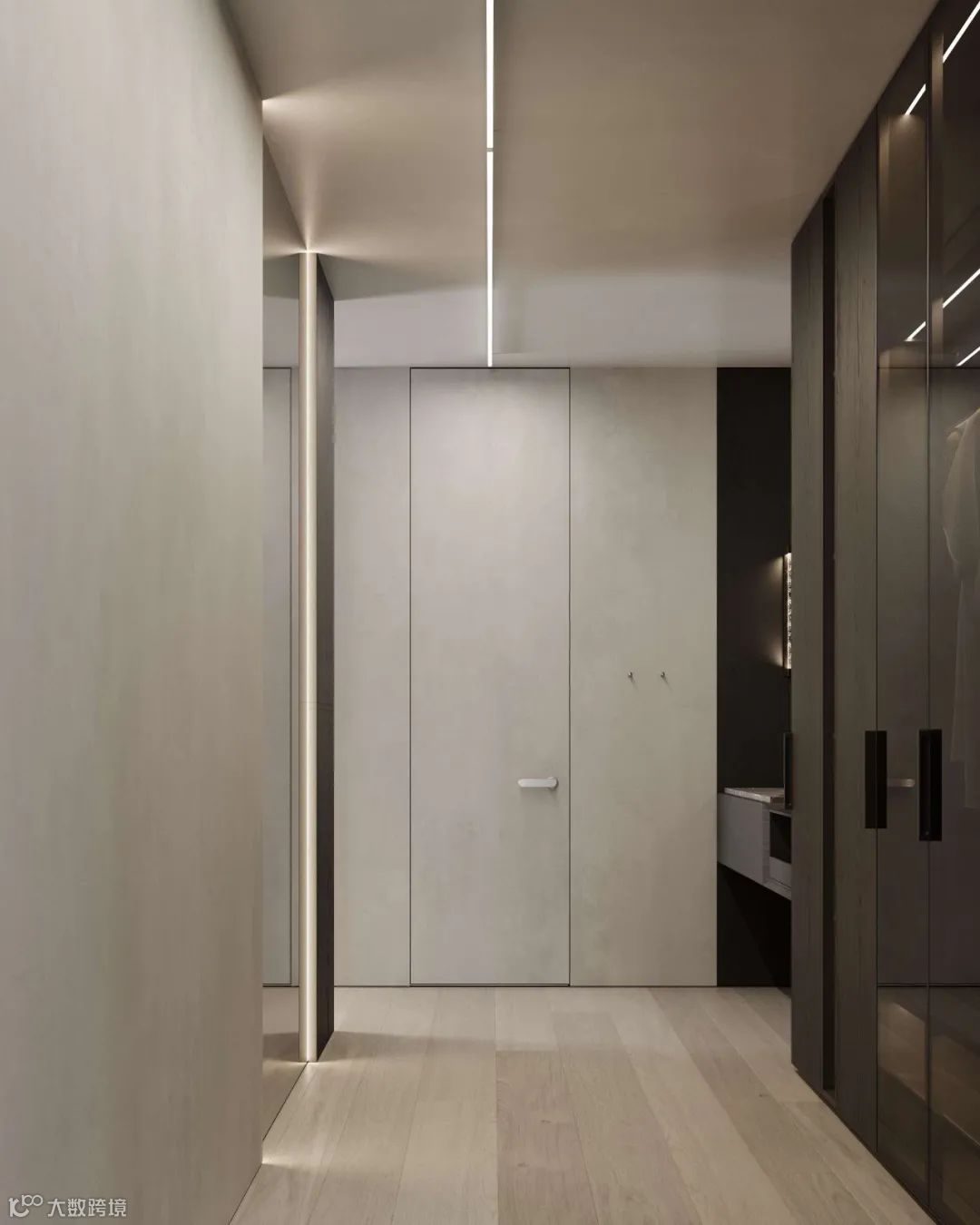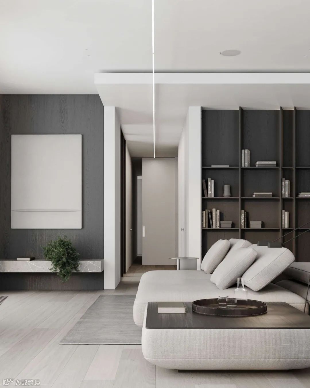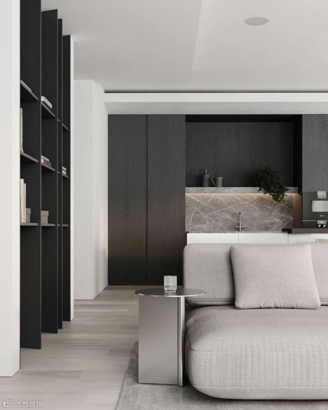 灰白的底色中,温润木材元素构建起冷暖平衡的空间韵律,再加上材质和灯光的运用凸显,使整个公寓质感与舒适度得到结合。