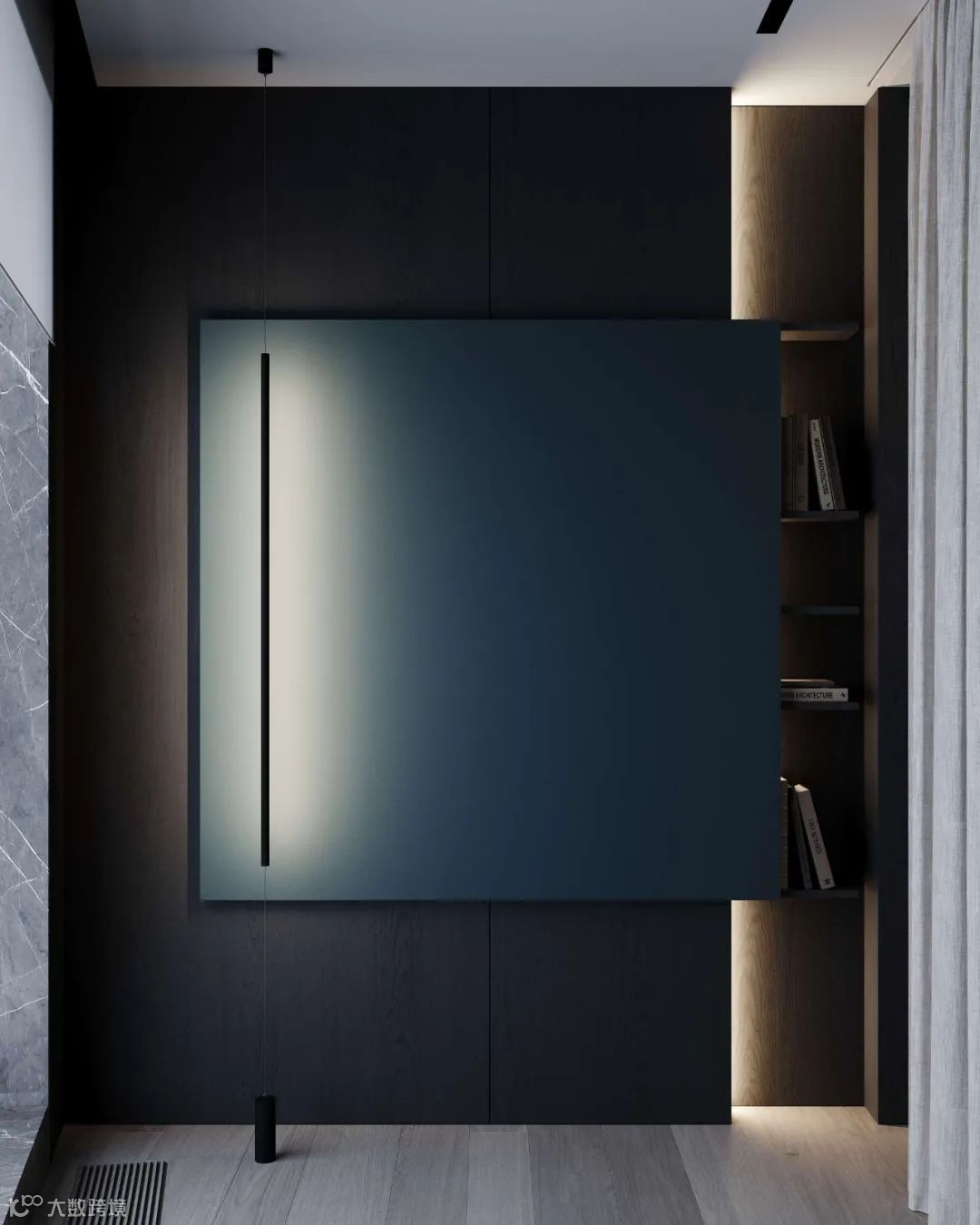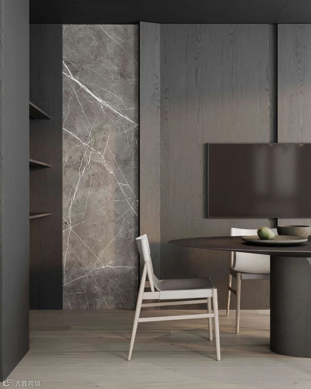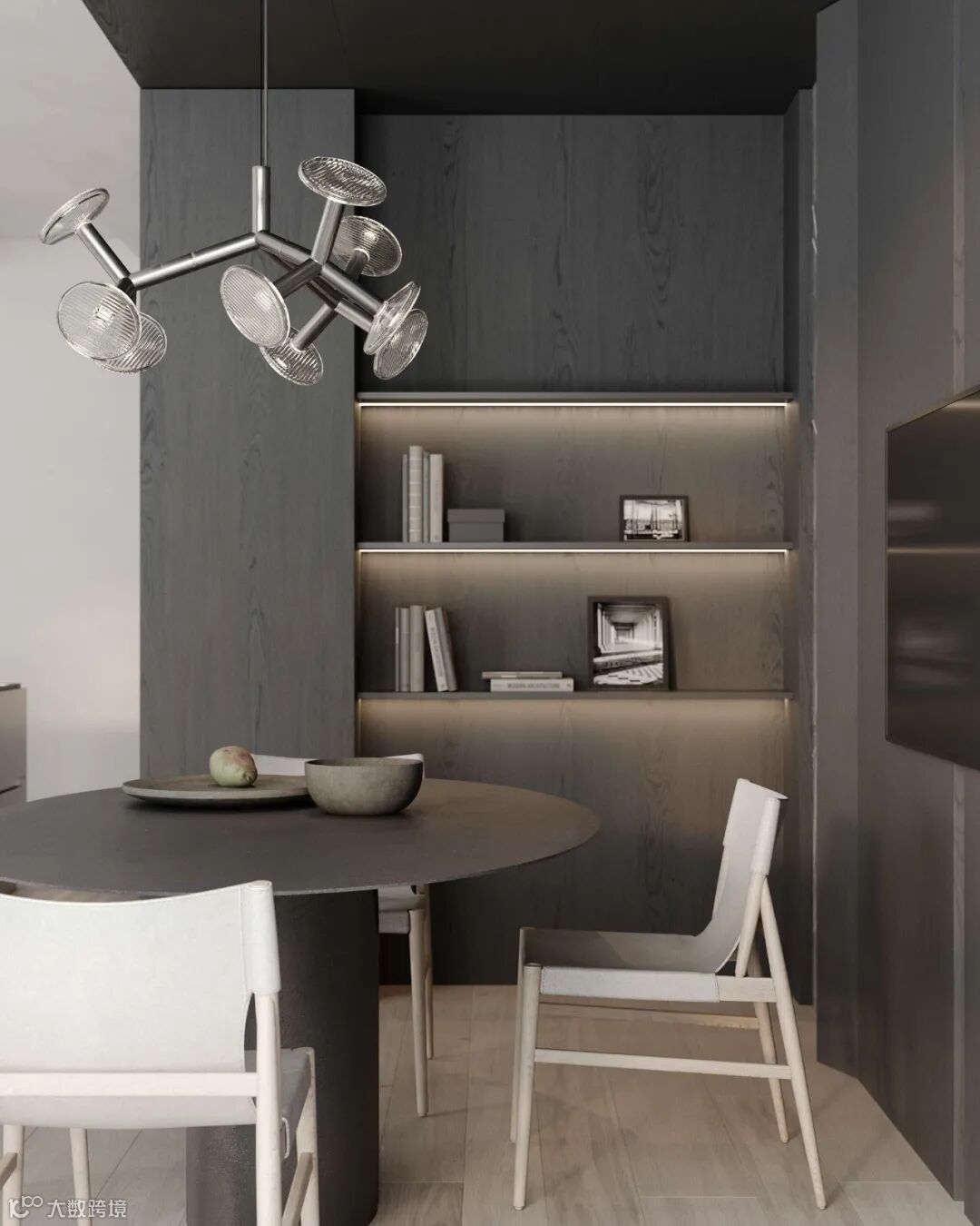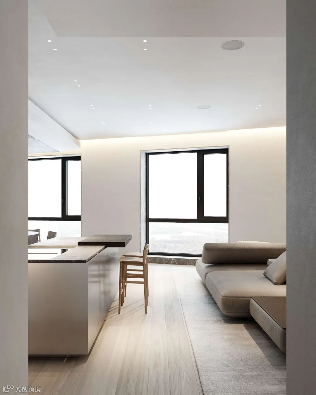灰白的底色中,温润木材元素构建起冷暖平衡的空间韵律,再加上材质和灯光的运用凸显,使整个公寓质感与舒适度得到结合。