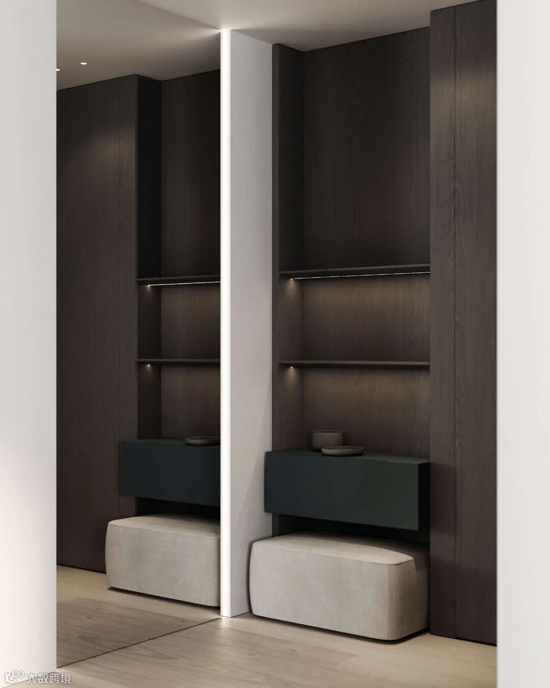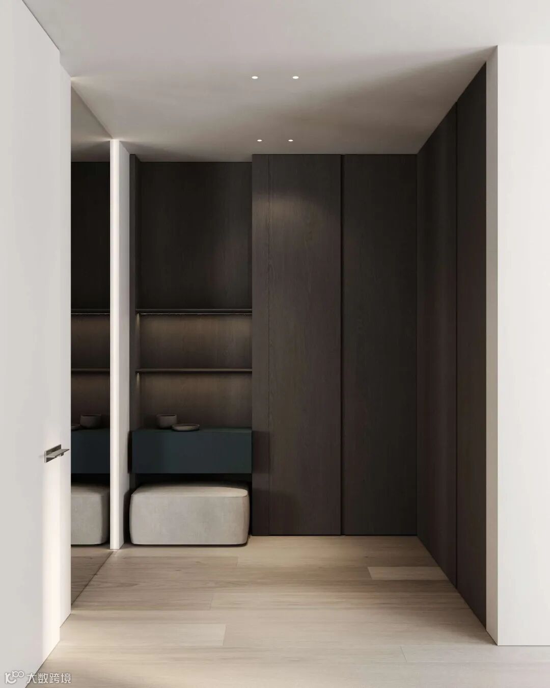 入门玄关形成相对独立的小空间,好比一道防线,嵌入式玄关柜体、LED感应筒灯等,让生活更具仪式。