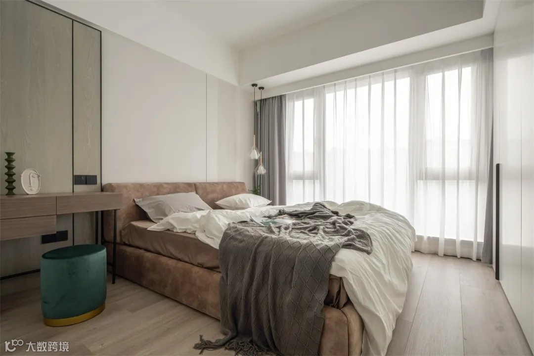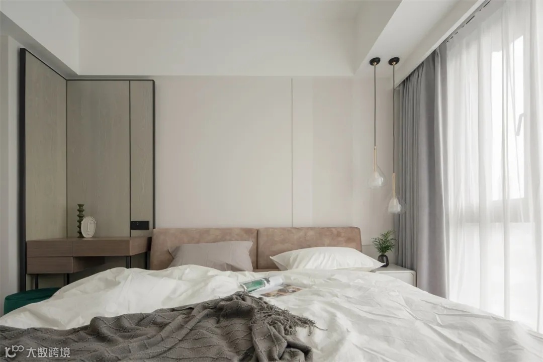 全屋都是无边框门,干净简约风格在细节处都得到很好的维护。床尾是一整墙的隐形收纳。