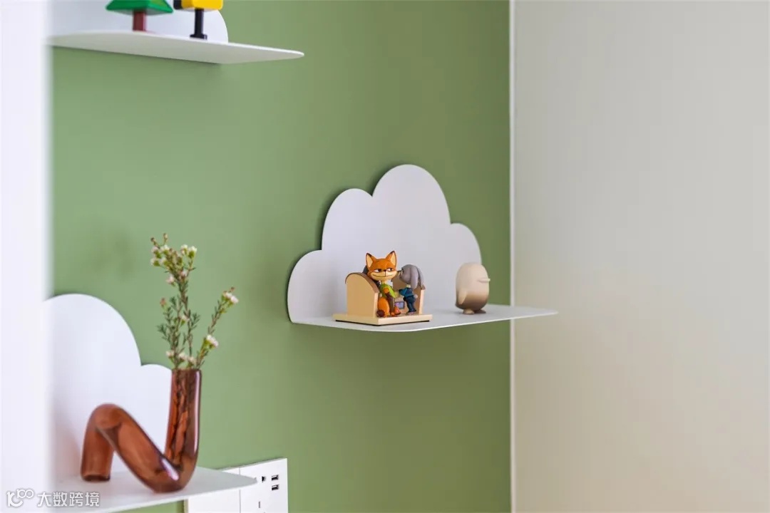 悬挂的小云朵上可以摆放小朋友喜欢的小玩具伙伴:可能是精灵古怪的小狐狸,也可能是憨态可掬的小企鹅、小树造型,小花瓶等等。