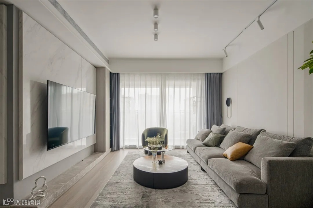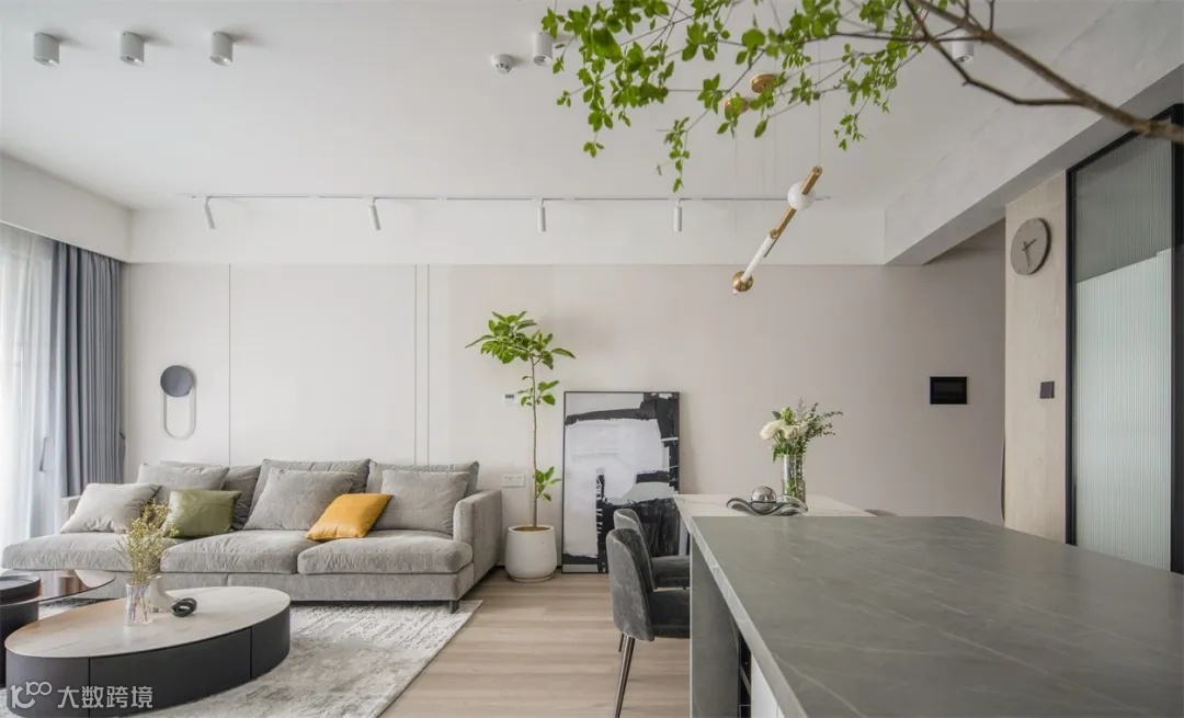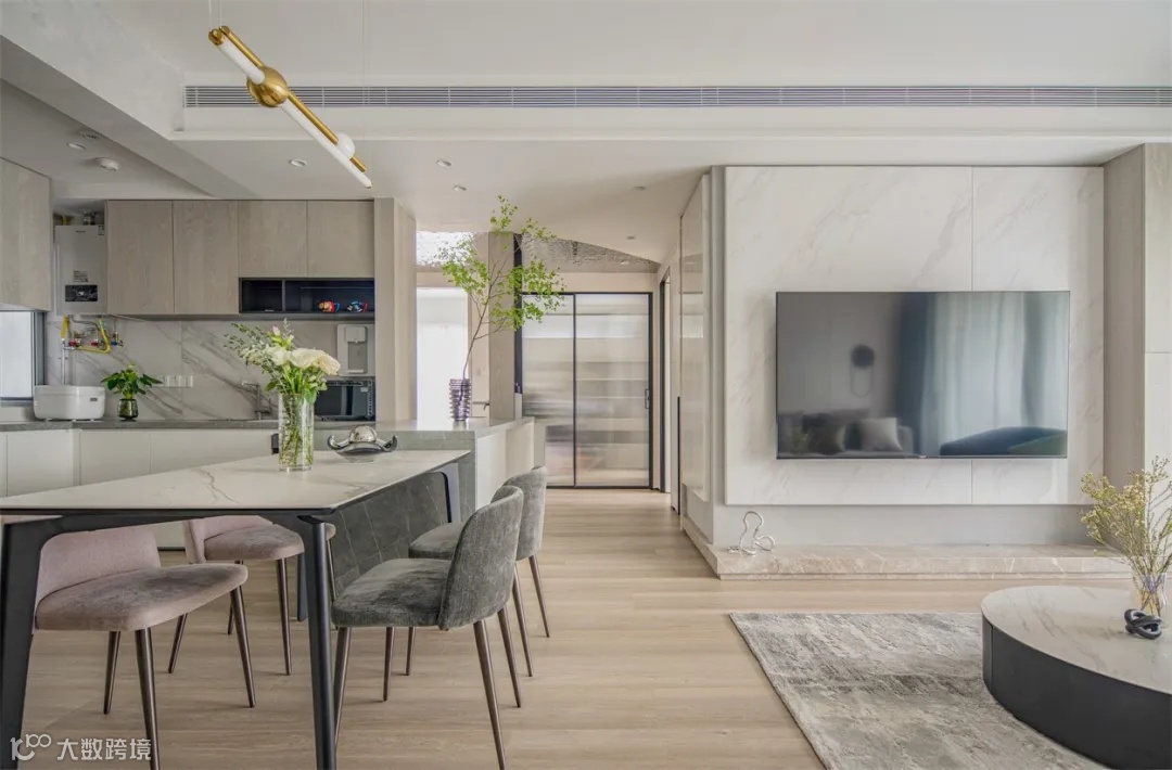 全屋通铺灰调地板,无主灯设计维护辽阔视野,奠定低调质感基调,完全开放式的餐厨区无形中放大了玄关与公区视野。