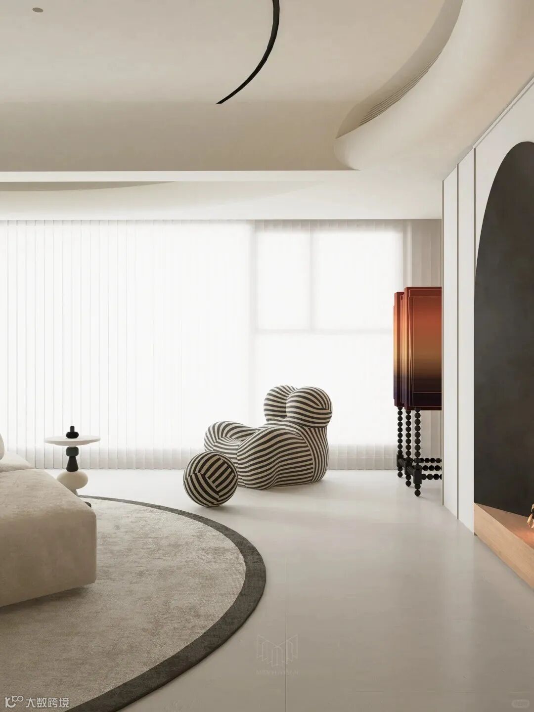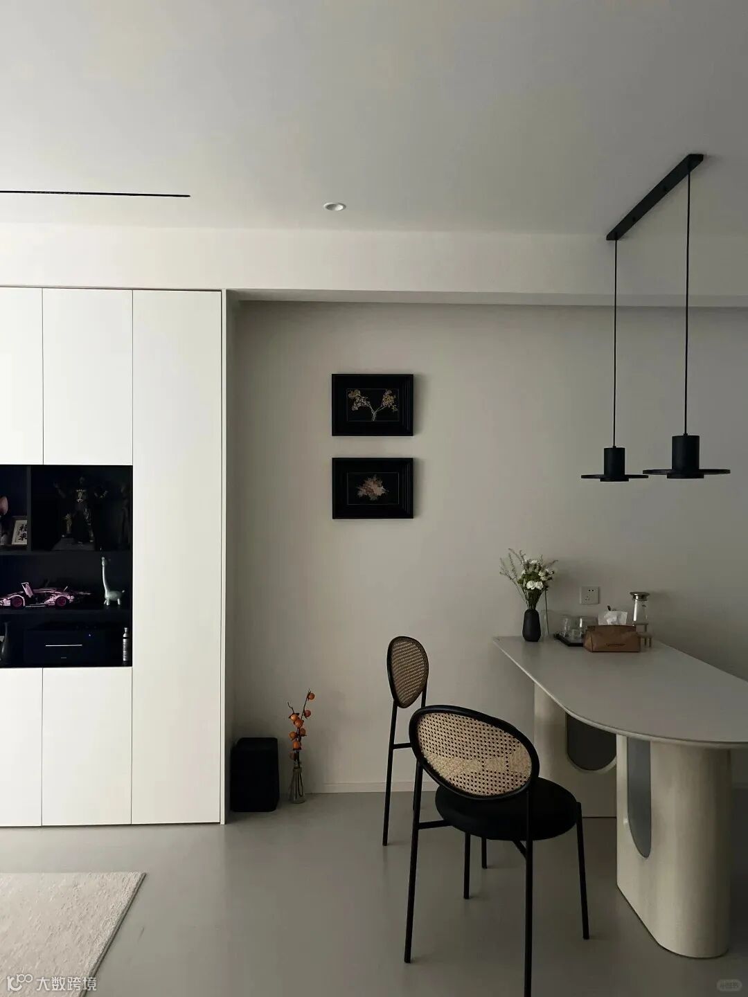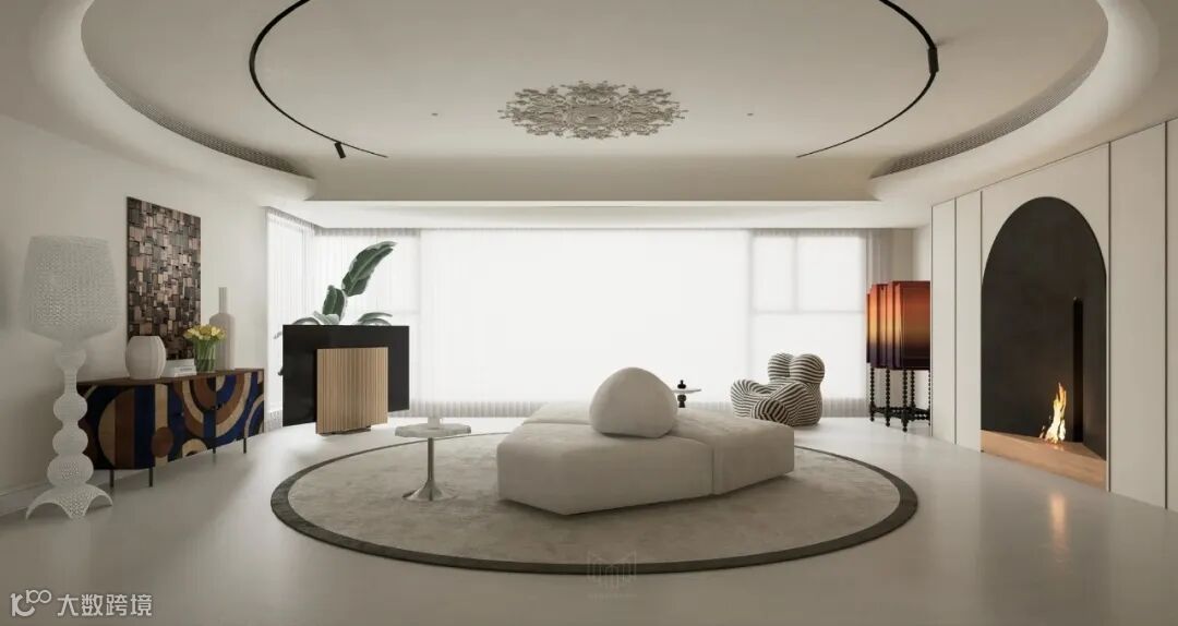 此外,少量但精心挑选的艺术品、绿植和灯具等配饰,为整个冷调的空间增添了一抹生动的色彩,让人感受到生活的温馨和艺术的温度。