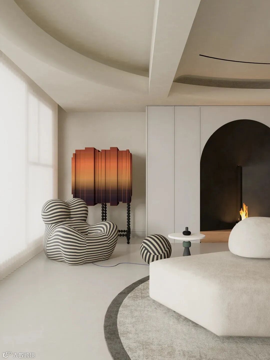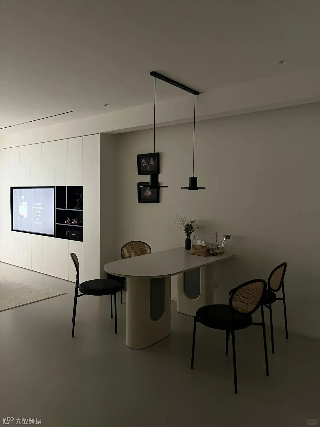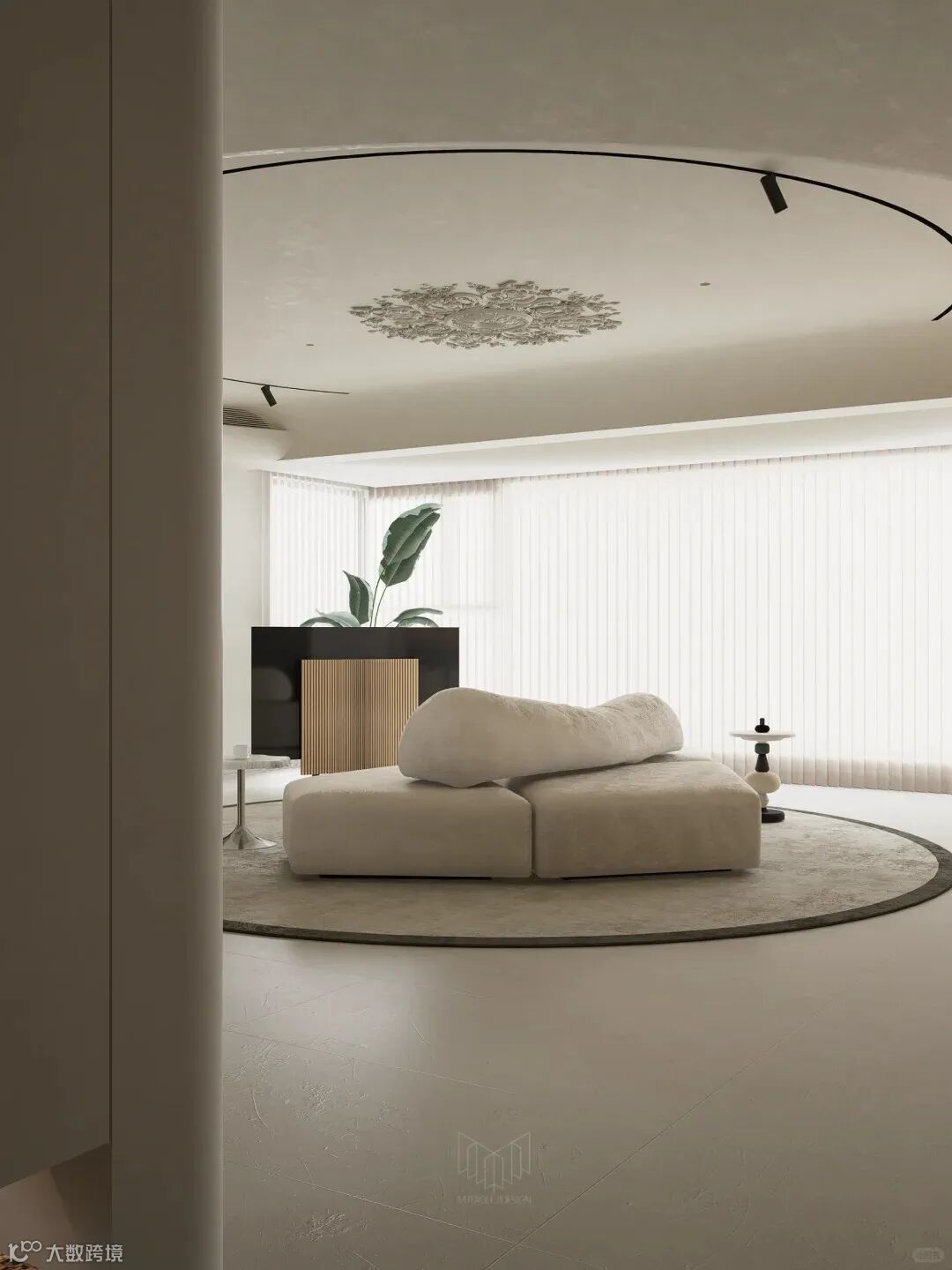 此外,少量但精心挑选的艺术品、绿植和灯具等配饰,为整个冷调的空间增添了一抹生动的色彩,让人感受到生活的温馨和艺术的温度。