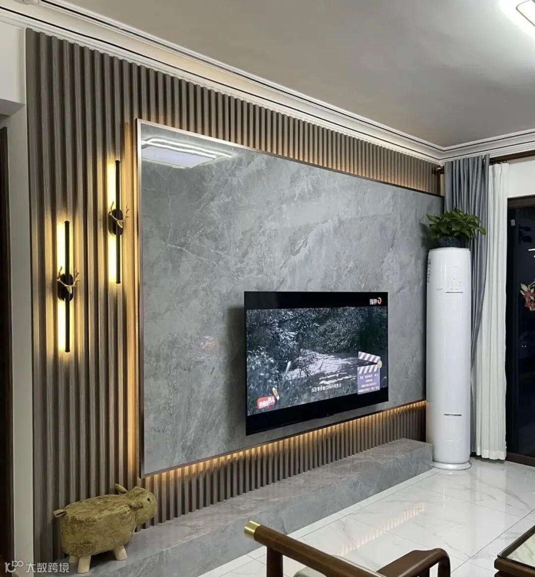 这个很好理解,电视墙电视才是核心,其他都可有可无。很多人费劲心思去设计电视墙,到头来发现还不如直接乳胶漆打底来得实在。像这种岩板+格栅的设计,初看不错,细看清洁难受。