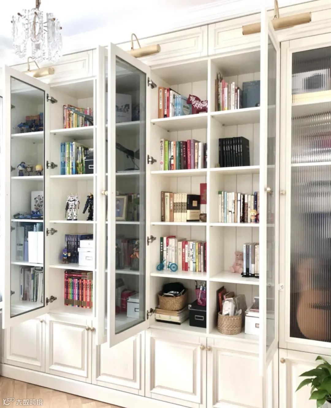 如果非要在客厅设计书柜,还是建议大家做带柜门的,如果觉得单板,可以加入一些玻璃门设计,效果虽然没有开放式那么好看,但清洁却很省事。