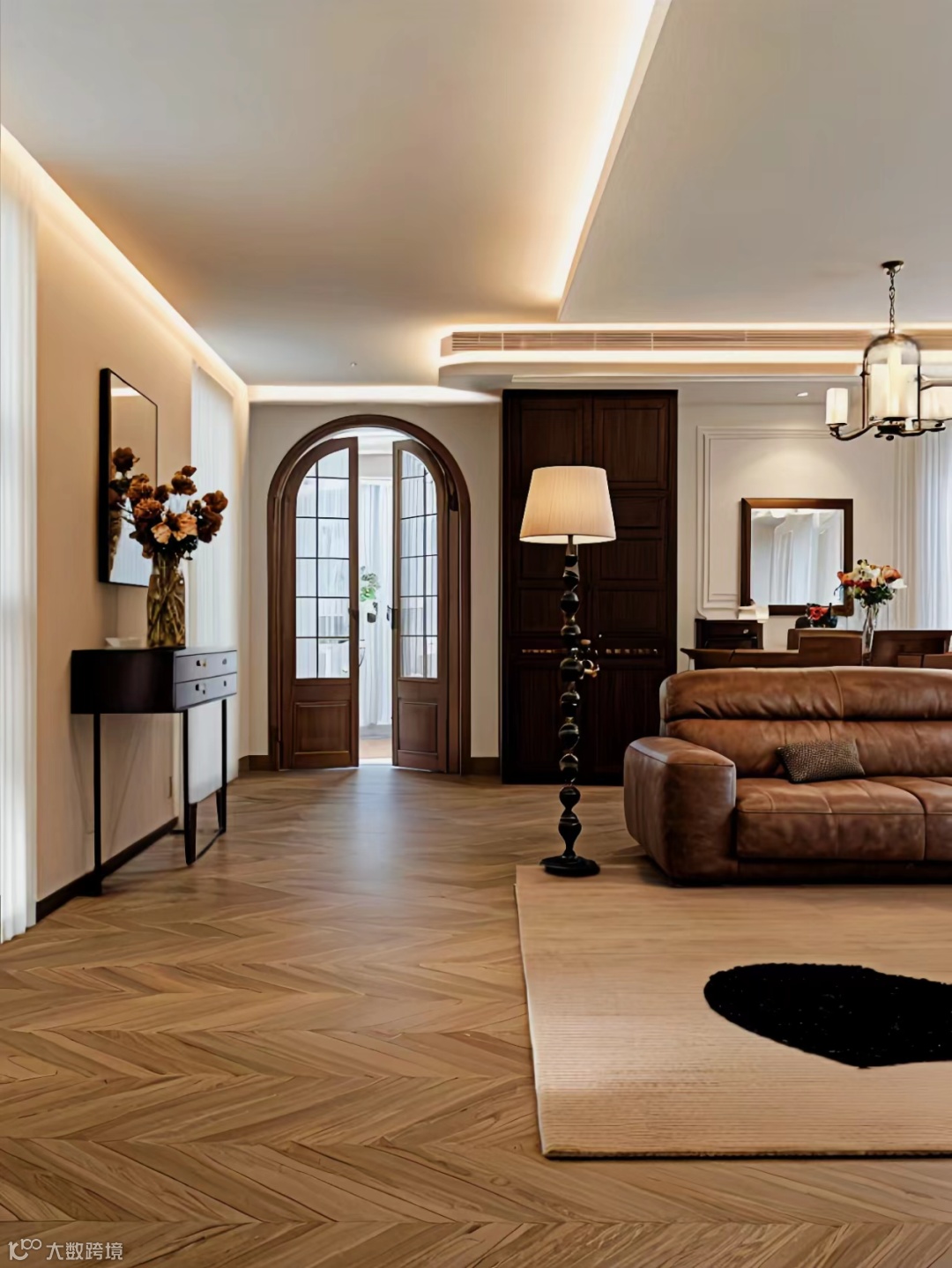 中古风跟法式风格一样,最好空间能高一些,所以吊顶方面可以做平顶,也可以做局部吊顶,甚至不需要做吊顶,简单的刷个乳胶漆就行,不需要做过多复杂的装饰。法式中古风则常用弧形、和雕花阴角线作为天花造型。