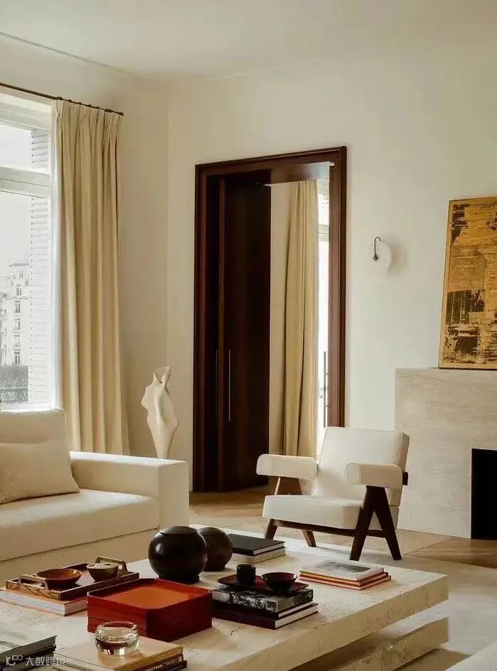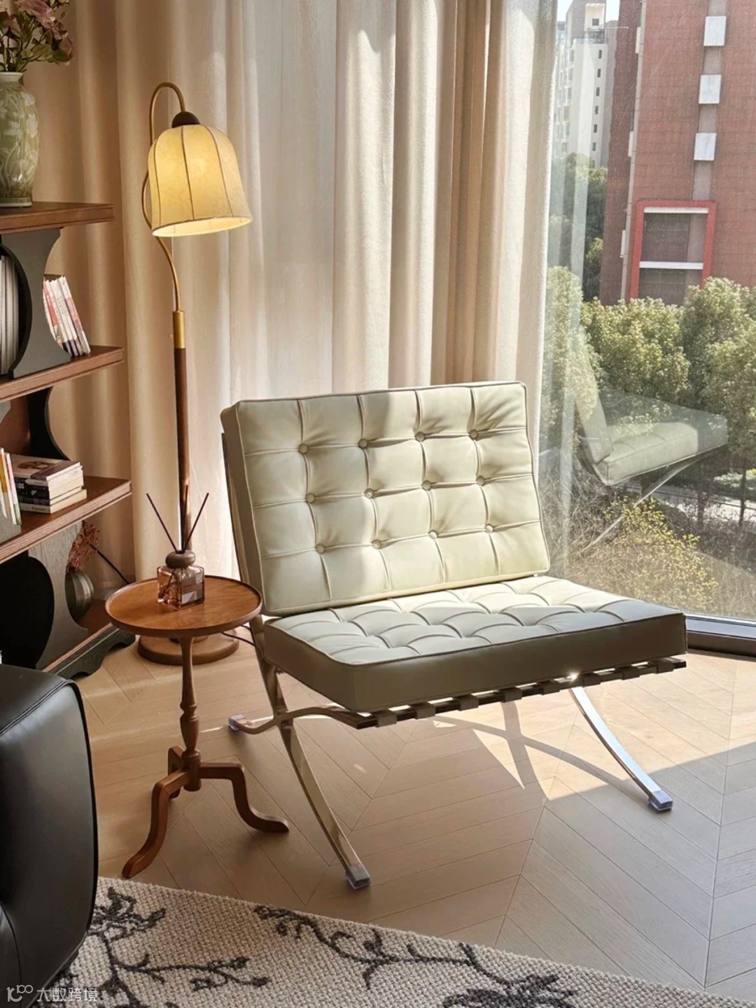原木、藤边、金属元素的深色家具非常适合中古风,像瓦西里中古椅、昌迪加尔椅、巴塞罗那椅都非常不错,沙发可搭配棕色、焦糖色的皮质沙发,如果你喜欢深沉一点,也可以搭配黑色。中古风就是因为有了这一抹深色,才让空间氛围变得浓郁耐看。