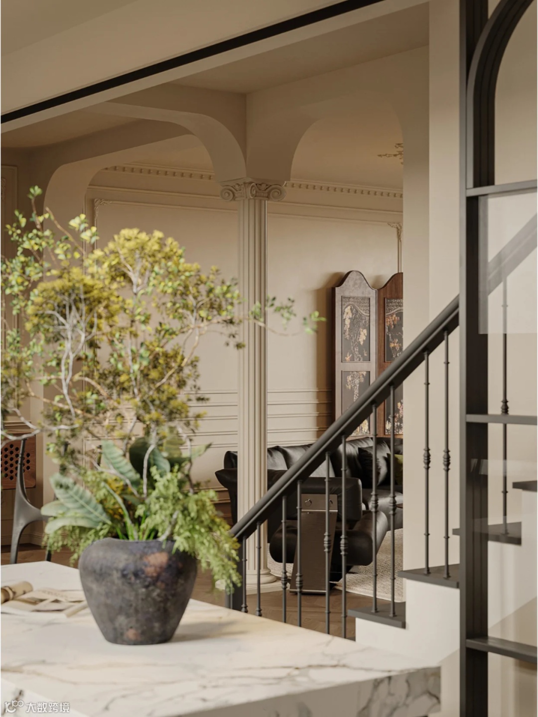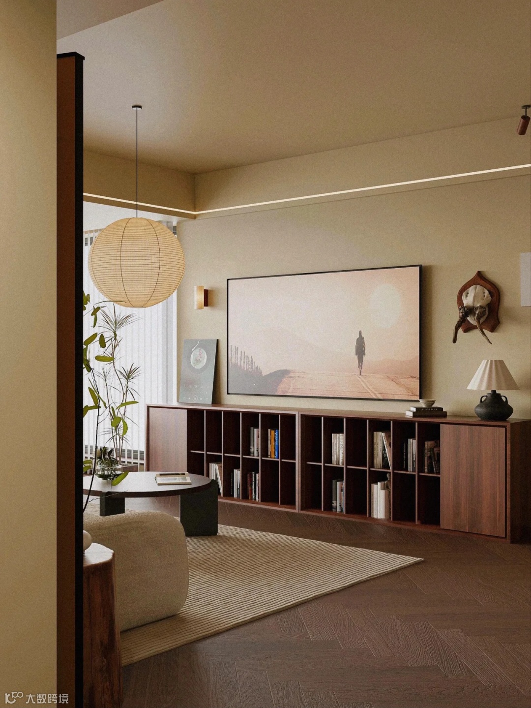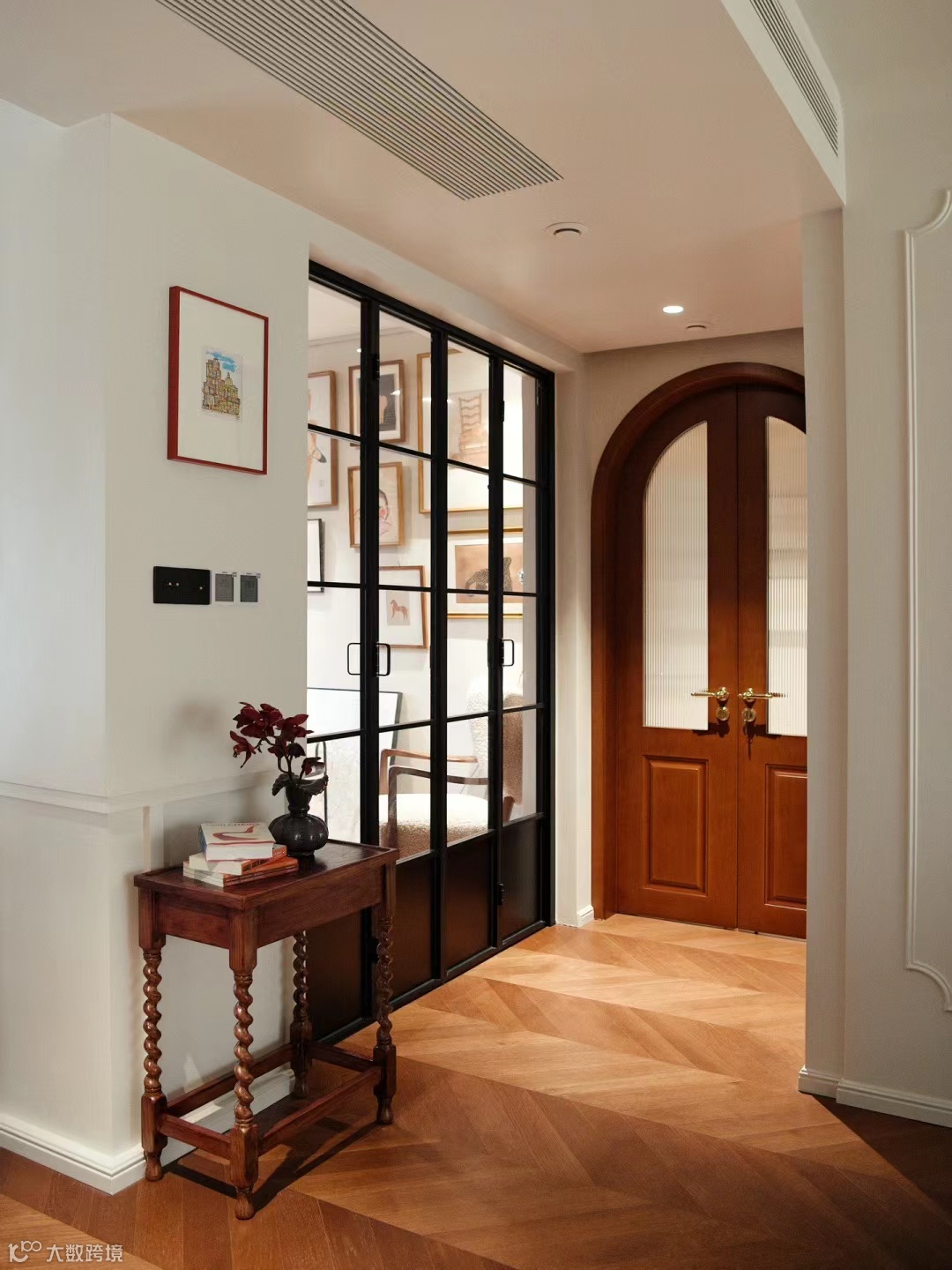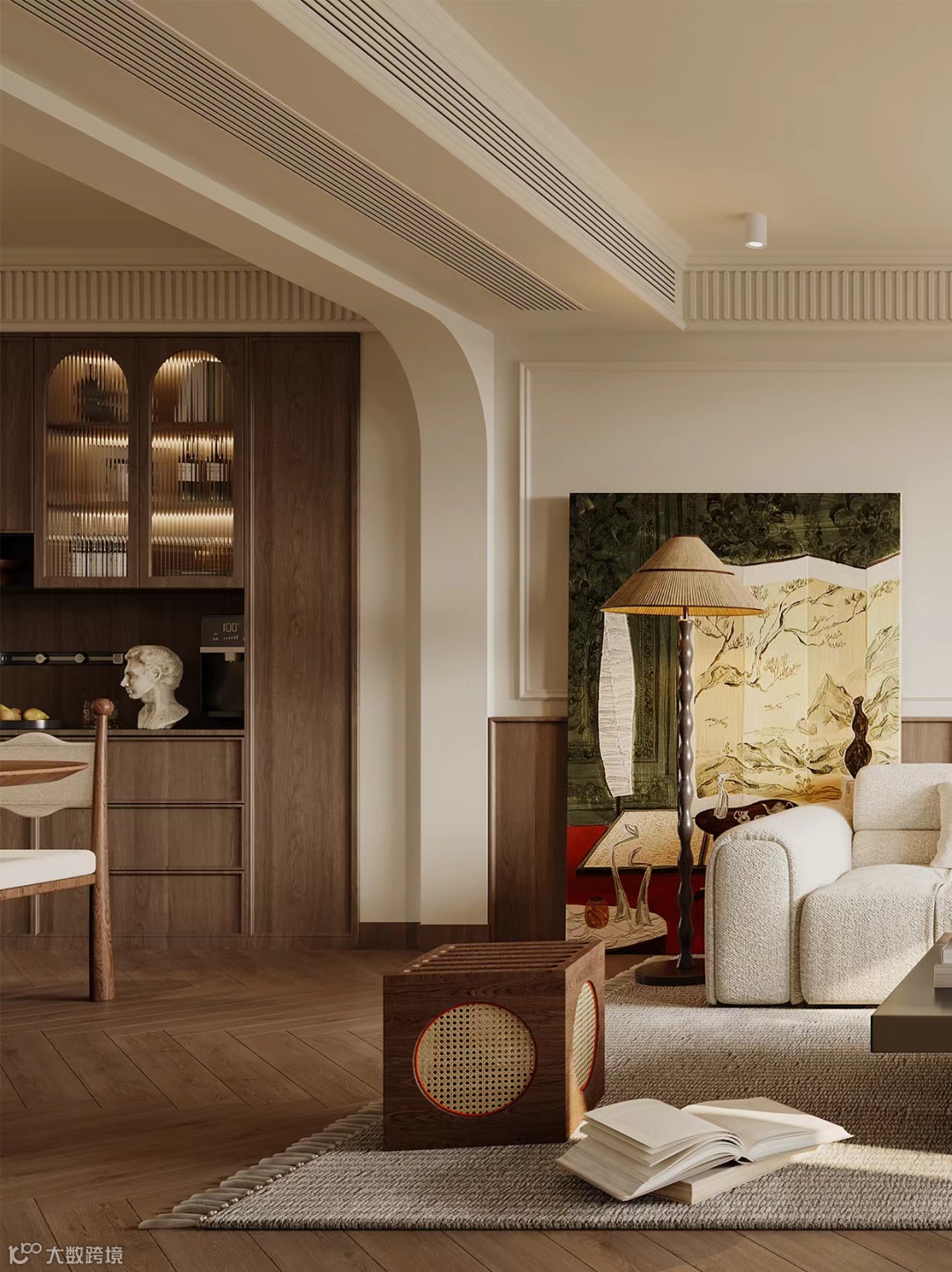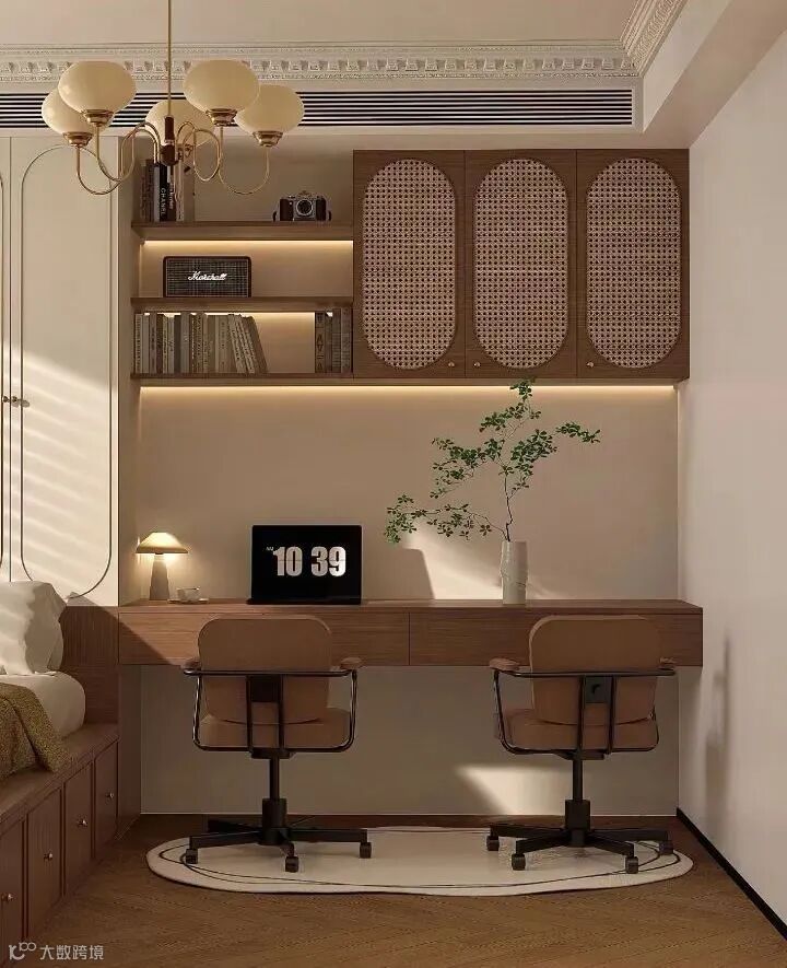 中古风的柜子告别了平板门,十字骨骼线的柜门最具代表性,是中古风硬装的重要元素。中古风收纳思路是注重分类,随拿随取是一种自洽的有序感,这是中古风生活气息浓郁的本质。柜门可以选择百叶、编藤、吸塑柜门这几种样式的,再搭配黄铜或者是古铜色的造型拉手,氛围感满满。