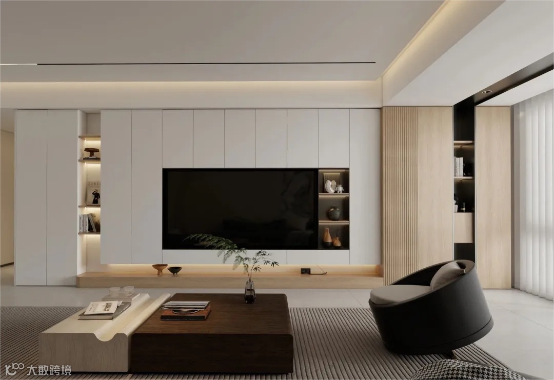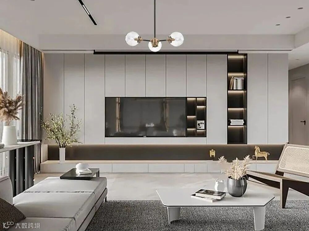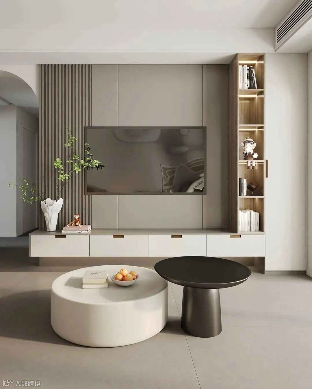 悬空电视柜设计,在视觉上给人以轻盈的简约感。底部抬高,方便扫地机器人穿梭,还可在底部加入灯带,让居室视觉层次更丰富。