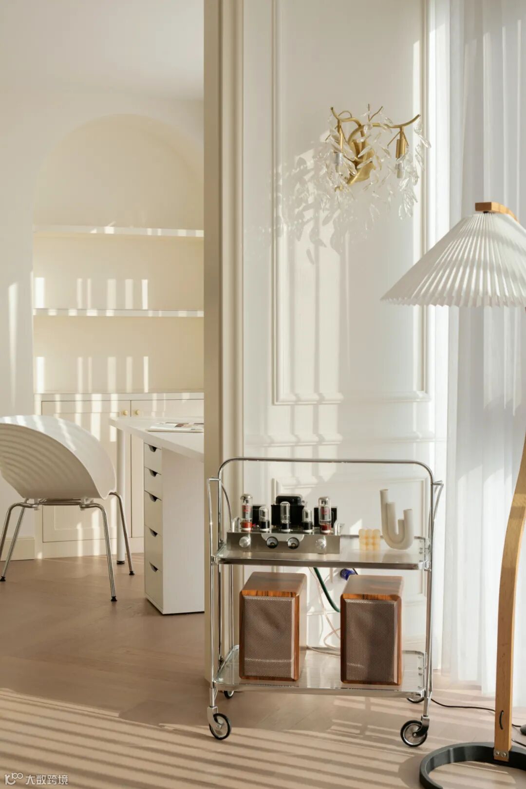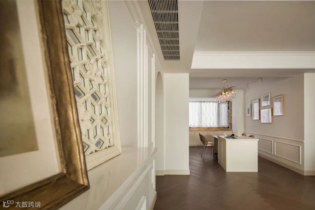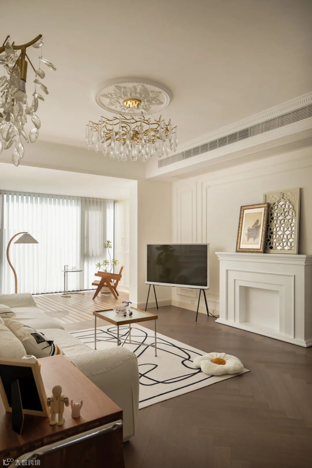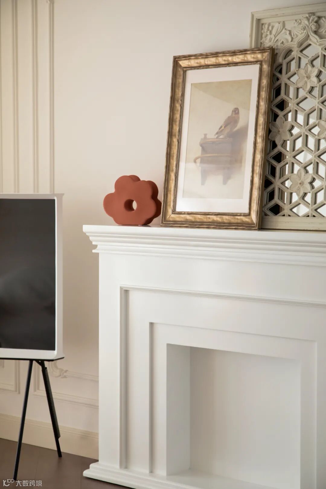 电视不上墙而是采用更加灵活的方法采用支架放于电视墙一角,以壁炉为视觉的中心,营造出简洁优雅而高级华丽的空间感。