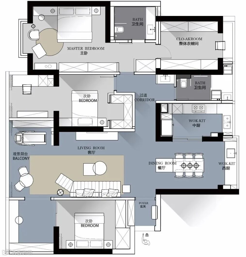 对于新家,屋主希望空间较大的南阳台作为休闲区;增加西厨,满足做烘焙需求; 主卧室在不影响空间大小情况下,增加衣柜。下面一起走进这个三代同堂的家中看看吧!