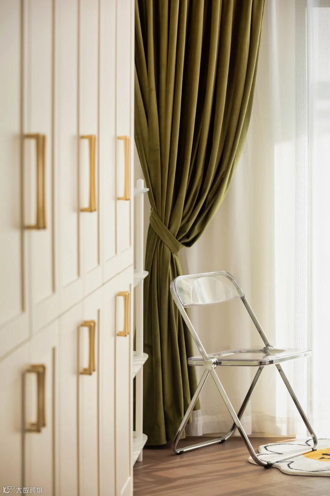 卫生间的洗手盆外置过道区域,以玻璃隔断设计,洗手盆区域以波浪纹墙砖+茶绿色的乳胶漆墙面,挂一面复古范的镜子,使得卫浴空间充满清新精致的气息。