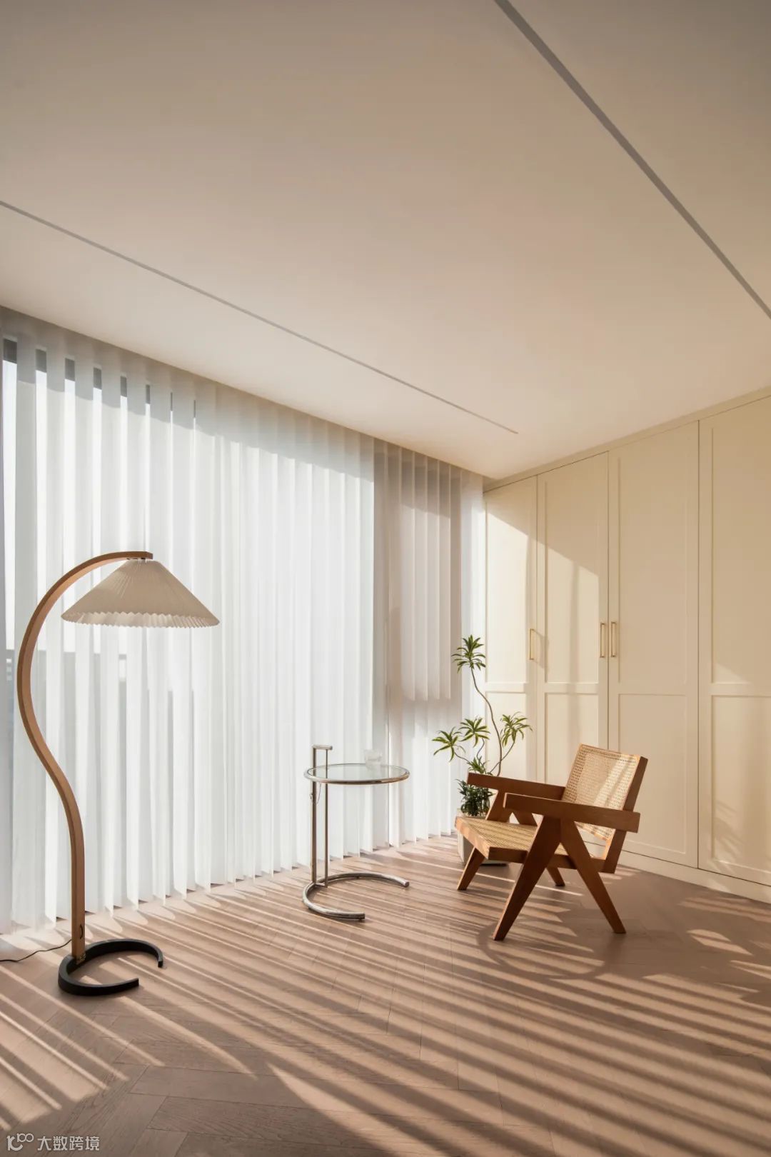 全视野的落地玻璃面,东升西入的时光痕迹,在藤编单椅上,增添了些许更悠远的趣味。