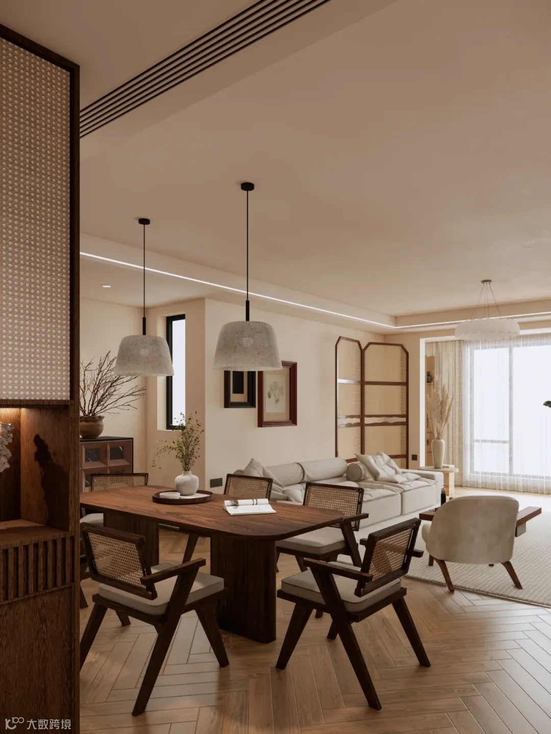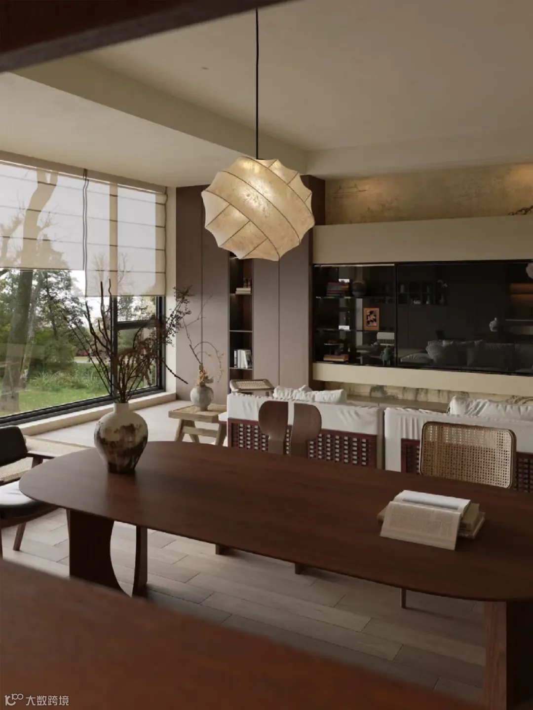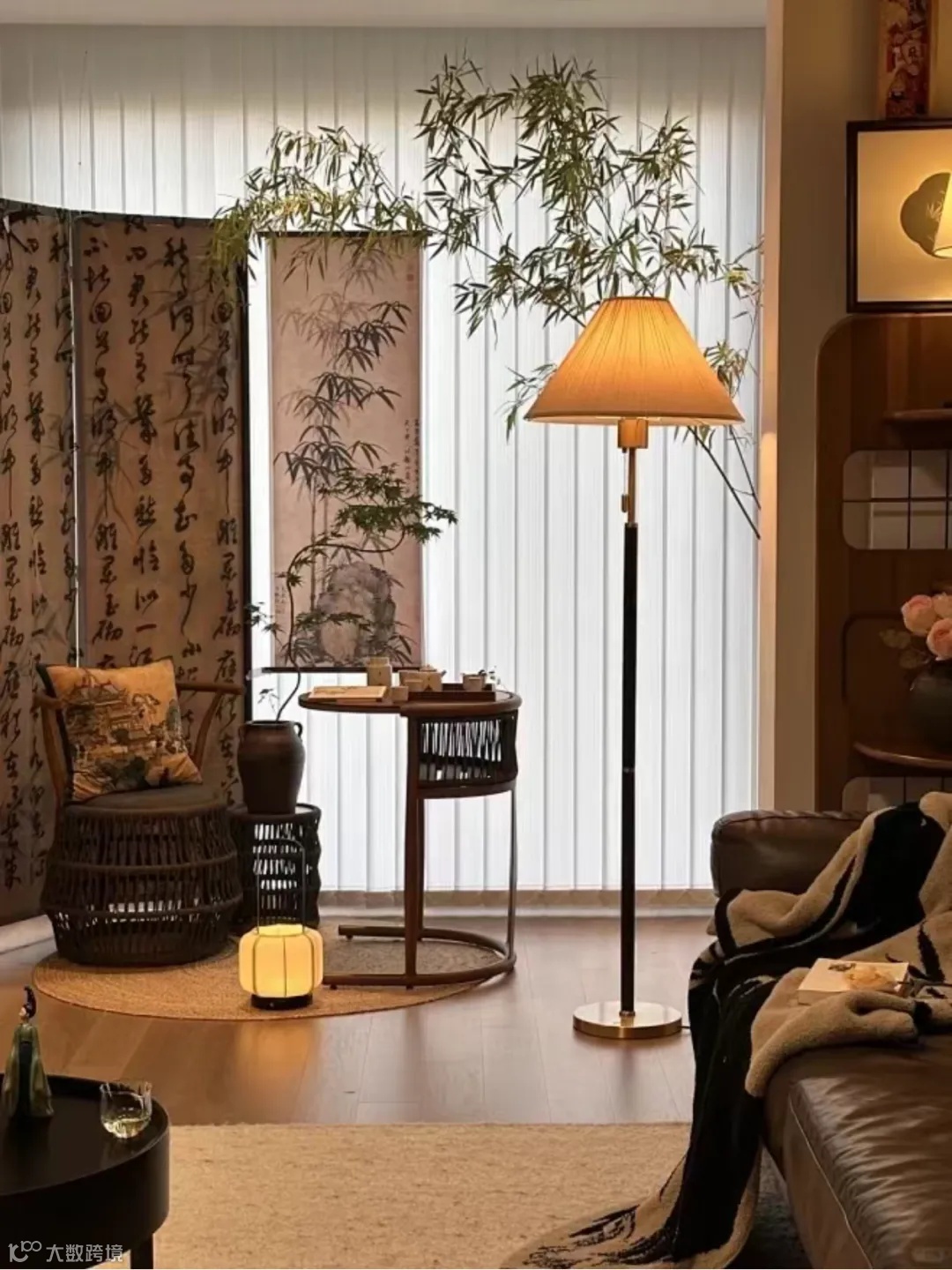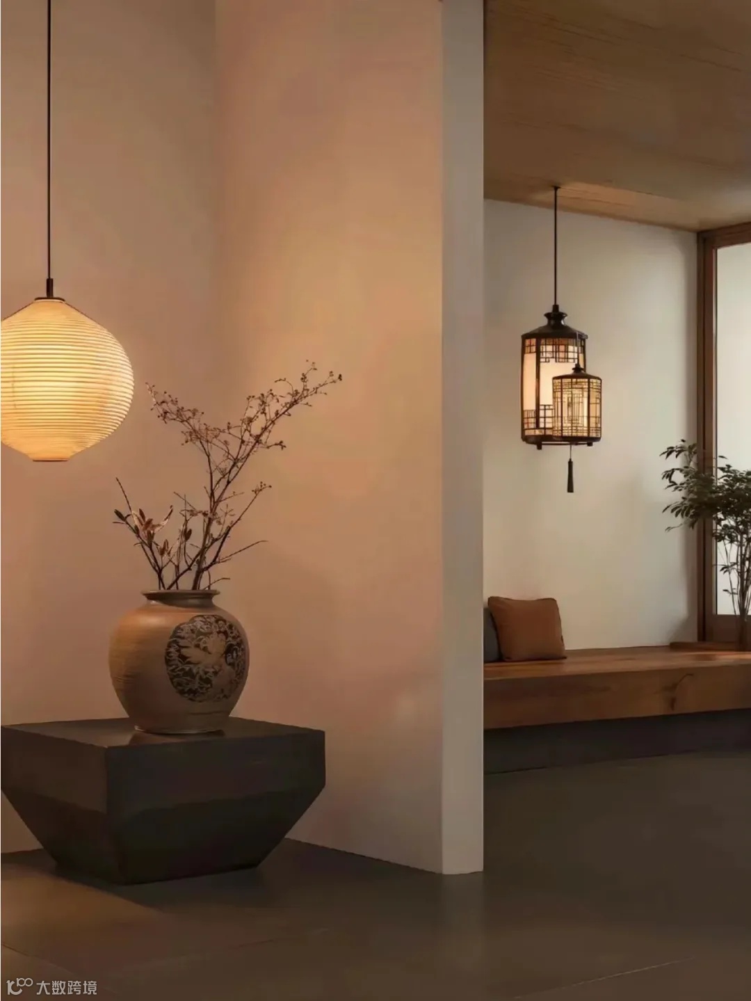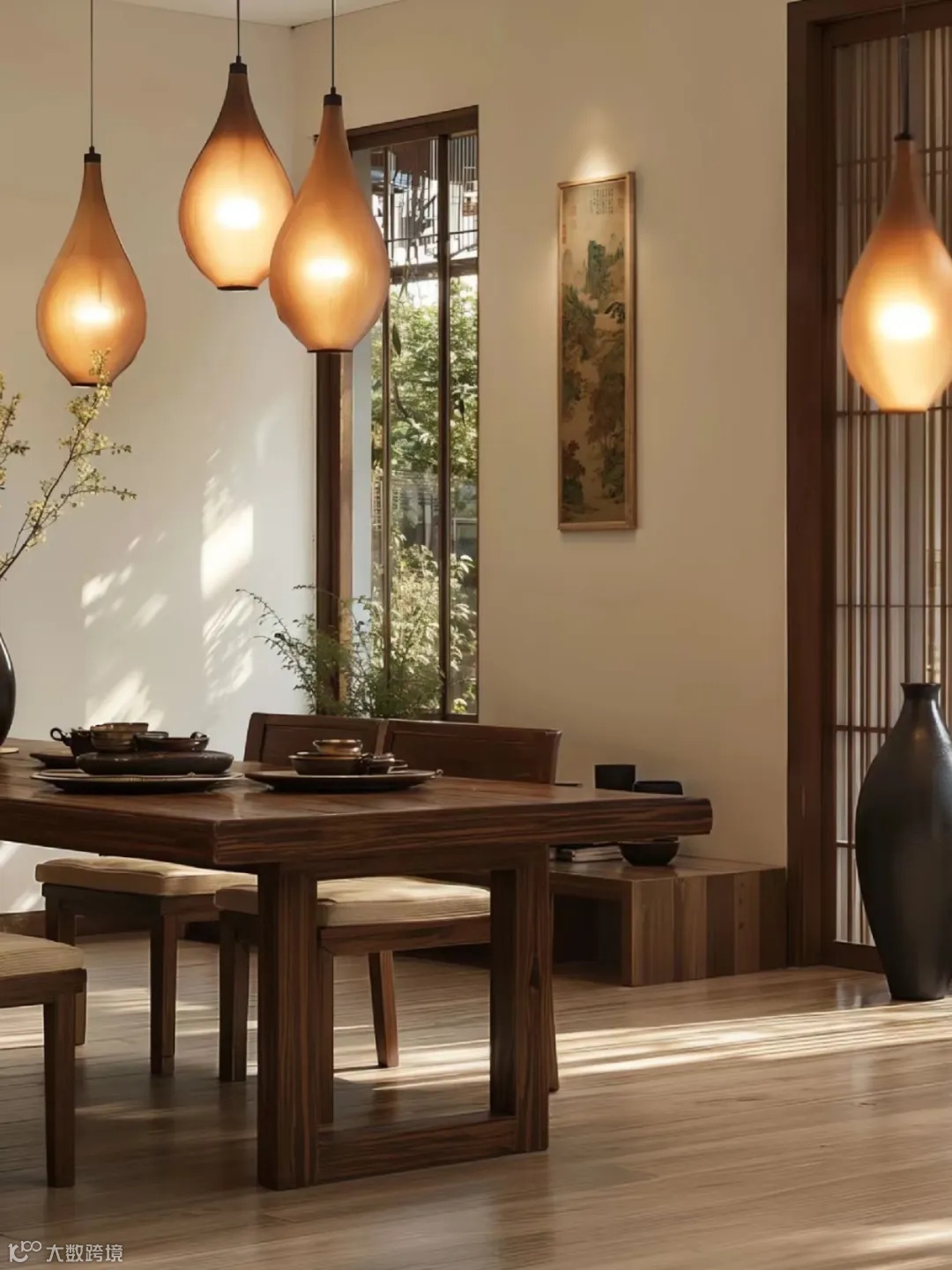 宋式美学的灯具要在颜色上跟家具形成统一,首选木质或者古铜的材质,灯罩就选蚕丝或者布艺的材质,形状上要选择几何线条感强一些的。