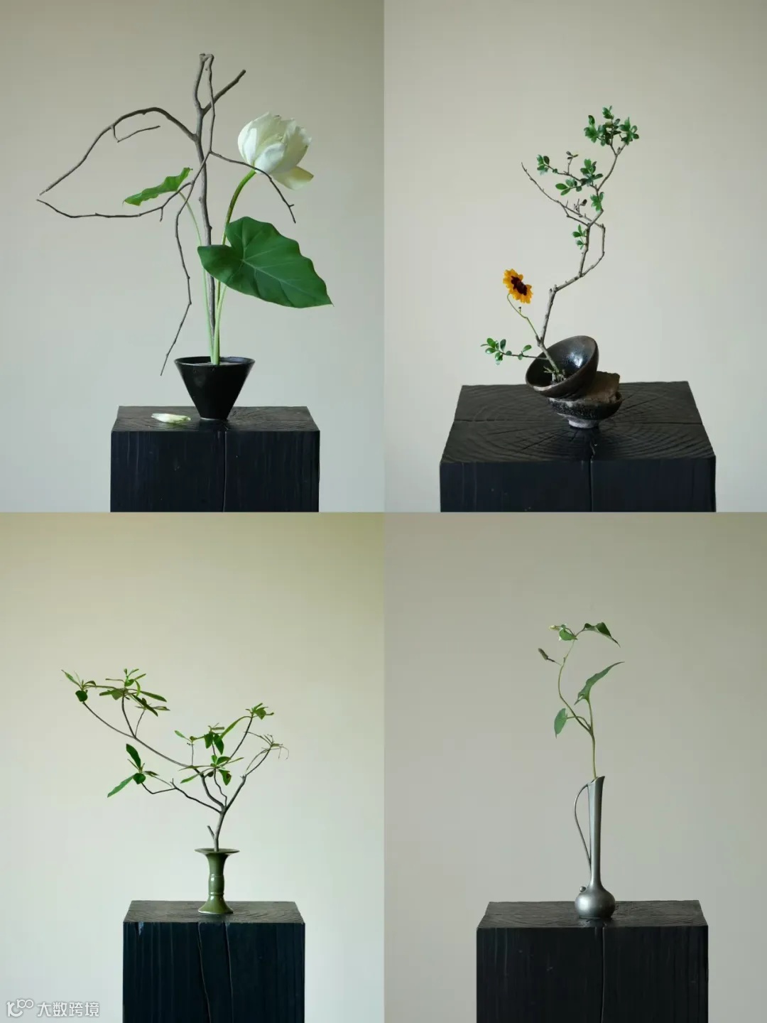 作为宋代四雅之一的插花,纤细柔美的造型才能够营造出宋式美学的禅艺。一定不要选择过于繁茂的绿植,建议选柳泉枫、南天竹、松、竹、梅、荷等这些纤细悠美又有美好寓意的绿植。