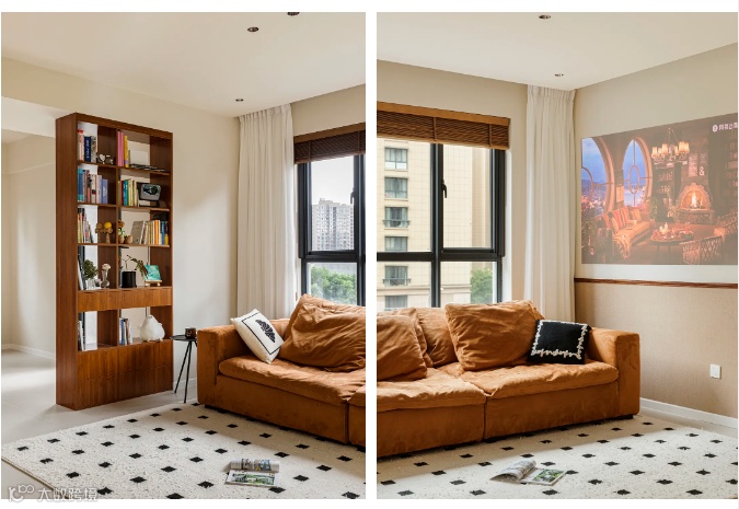房主是一对年轻的艺术家夫妻,保留柔软舒适的沙发,装上投影,放上书架,白天借着充足的阳光阅读充电,晚上关灯享受一部韵味悠长的老电影。