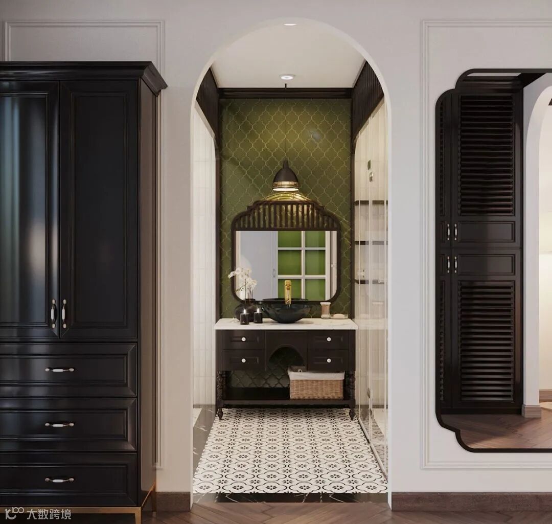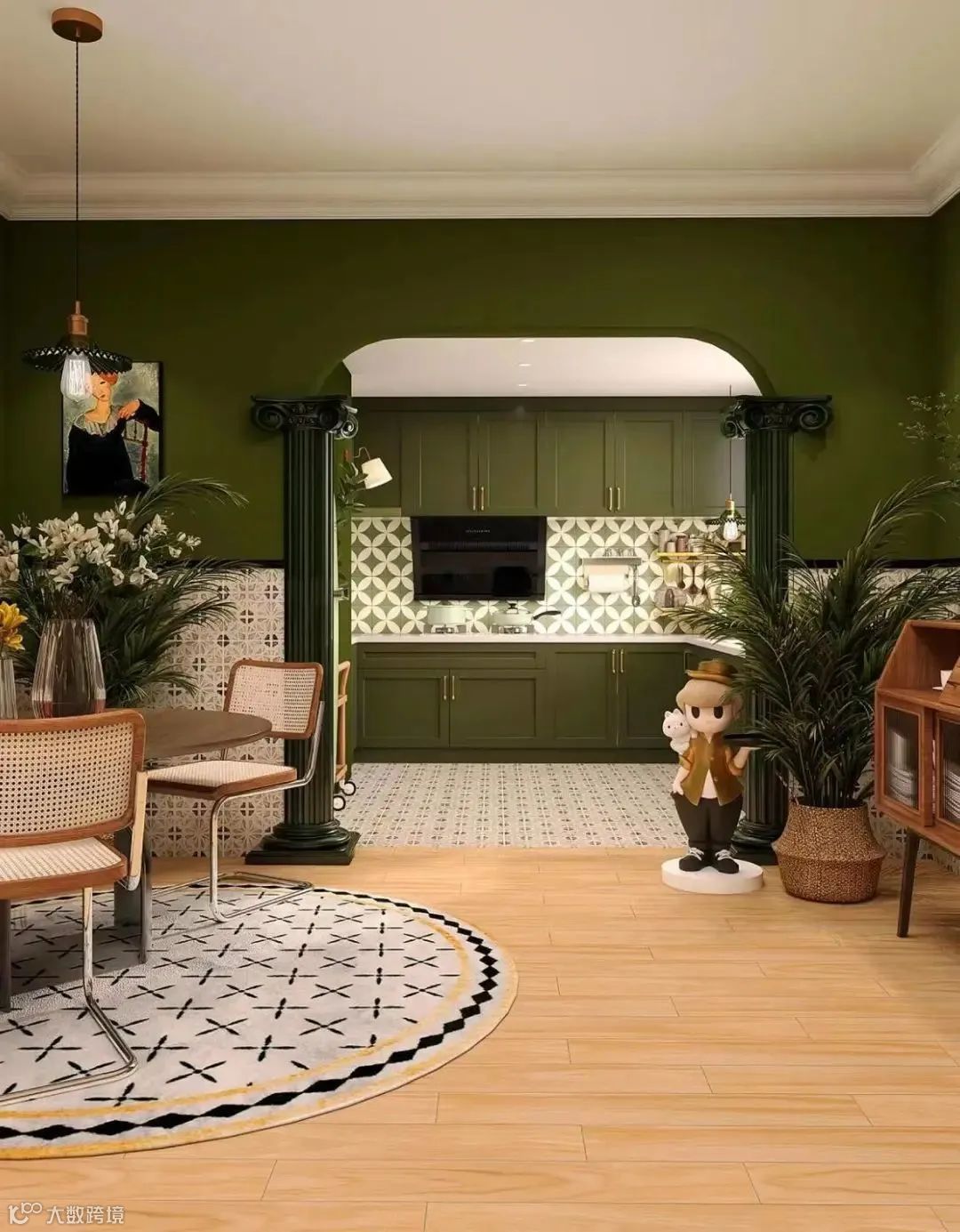 南洋风格里因为地理气候的原因,经常会出现绿色系,绿色的点缀可以一定程度上给视觉降温,南洋绿作为南洋风中必不可少的配色之一,它亮眼、治愈、复古,可深可浅,有极佳的空间适配能力。