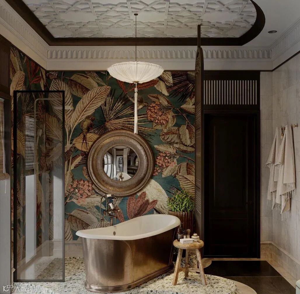 在装饰壁纸的选择上,可以采用棕榈叶等比较具有南洋风情的软装元素,为空间注入大自然的生机并使其具有探索的神秘感。