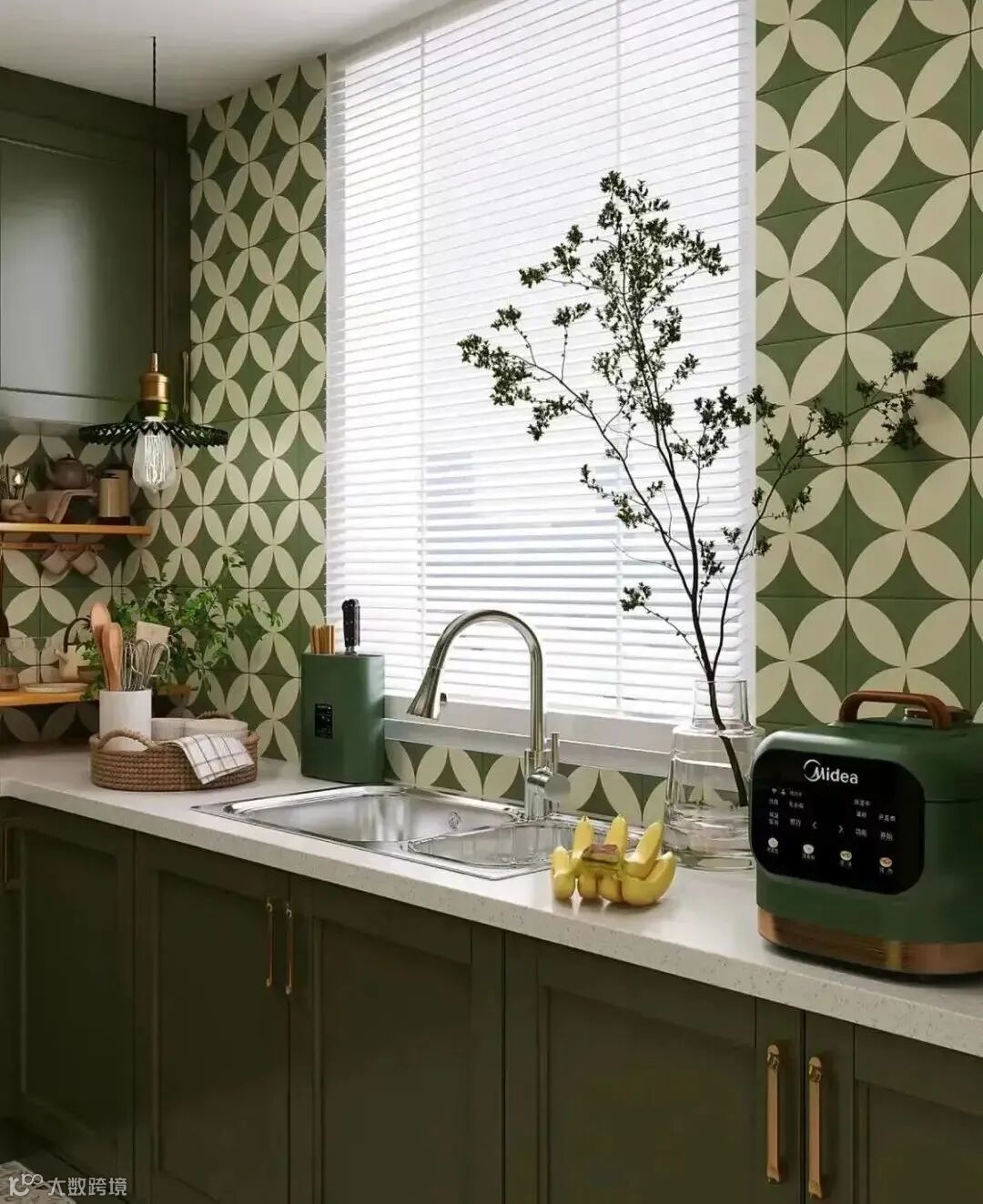 采用复古绿拼色半墙+中古花纹绿植墙纸的方式塑造南洋风。也可使用半墙护墙板,或使用极简墙面腰线自然分割,打造“假护墙板”效果。