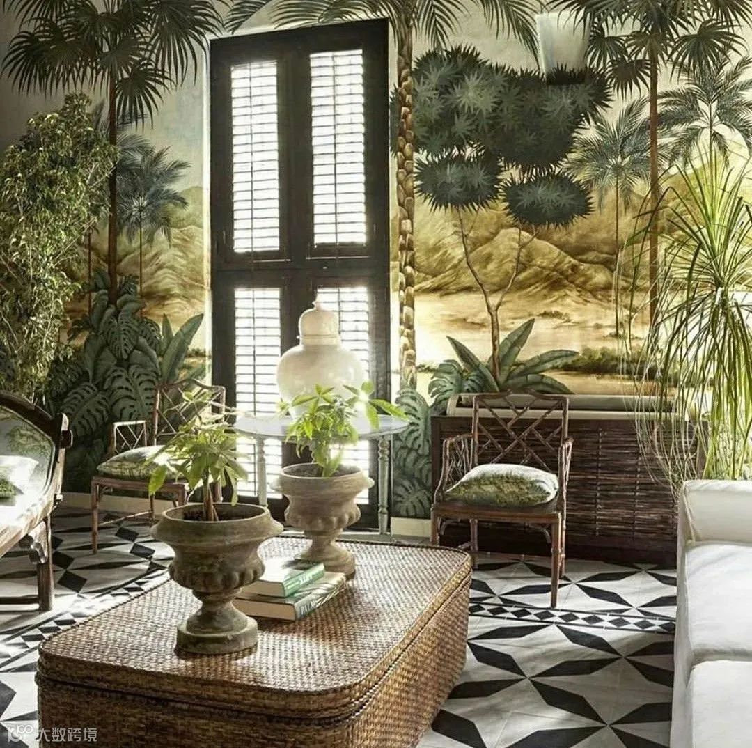 热带风情植物、花砖、木门、玻璃门洞、百叶窗、藤编家具和亚麻元素等是南洋风常见元素。