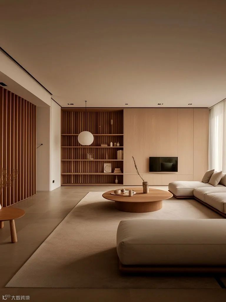 杏色卡其客厅是三分熟。浅色的美拉德风格,以卡其色、杏色为主色调,搭配乳白色墙面,空间显得更有层次,明亮又温柔。
