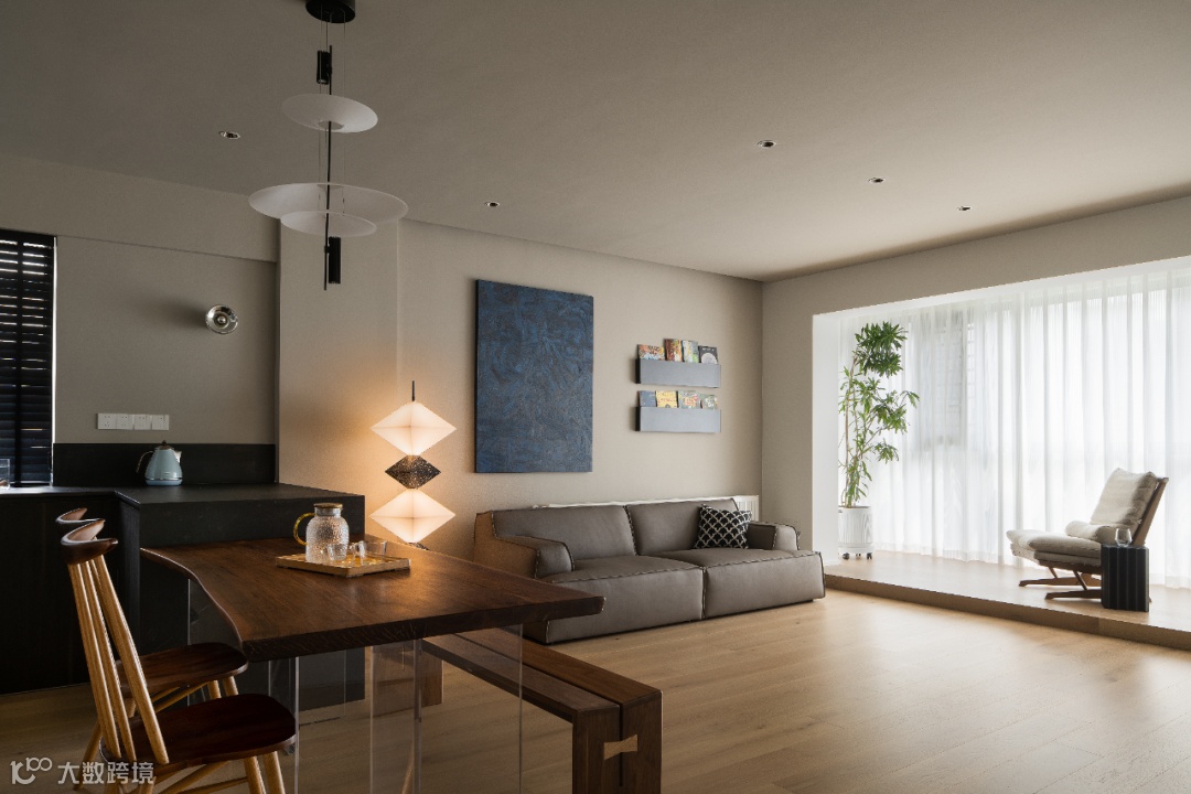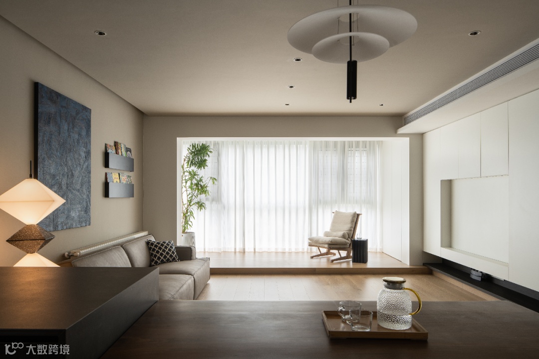 将阳台与客厅打通,通过地台形成空间上的视觉延伸感,空间更加明亮通透。