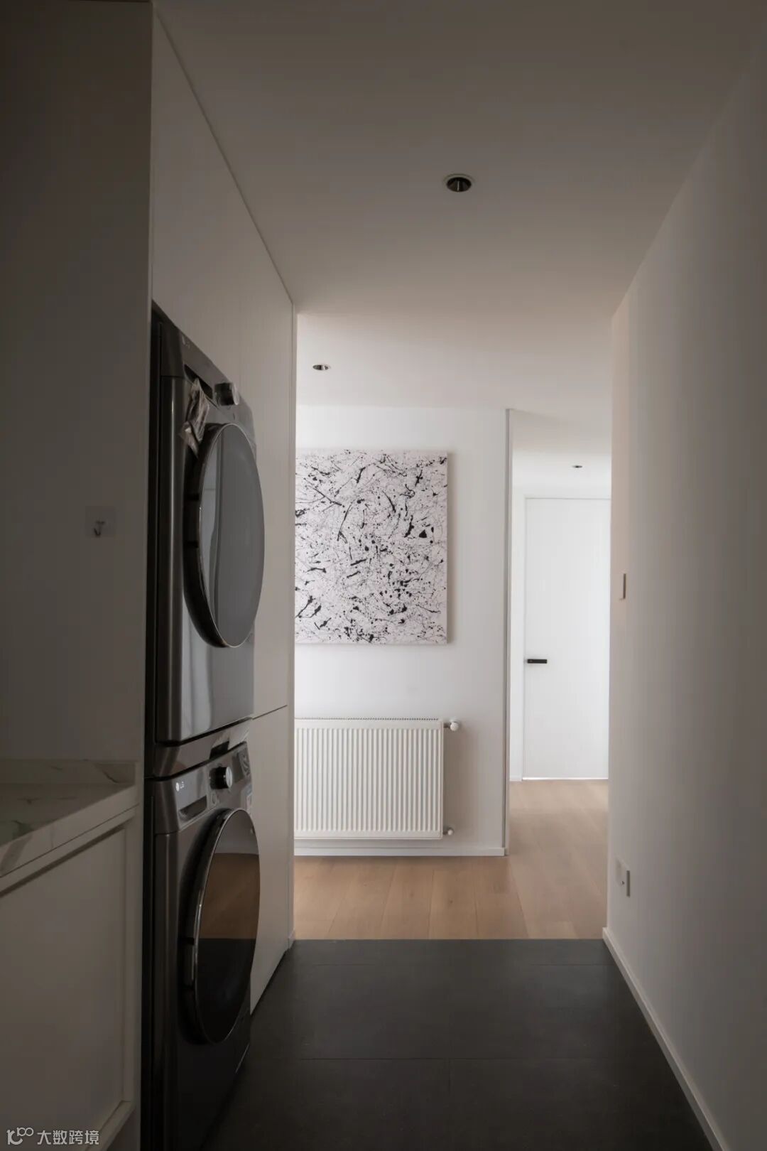 U型白色橱柜+白色墙砖,与地面形成深浅色调的对比,U型橱柜储物充足,操作台面也很宽敞。