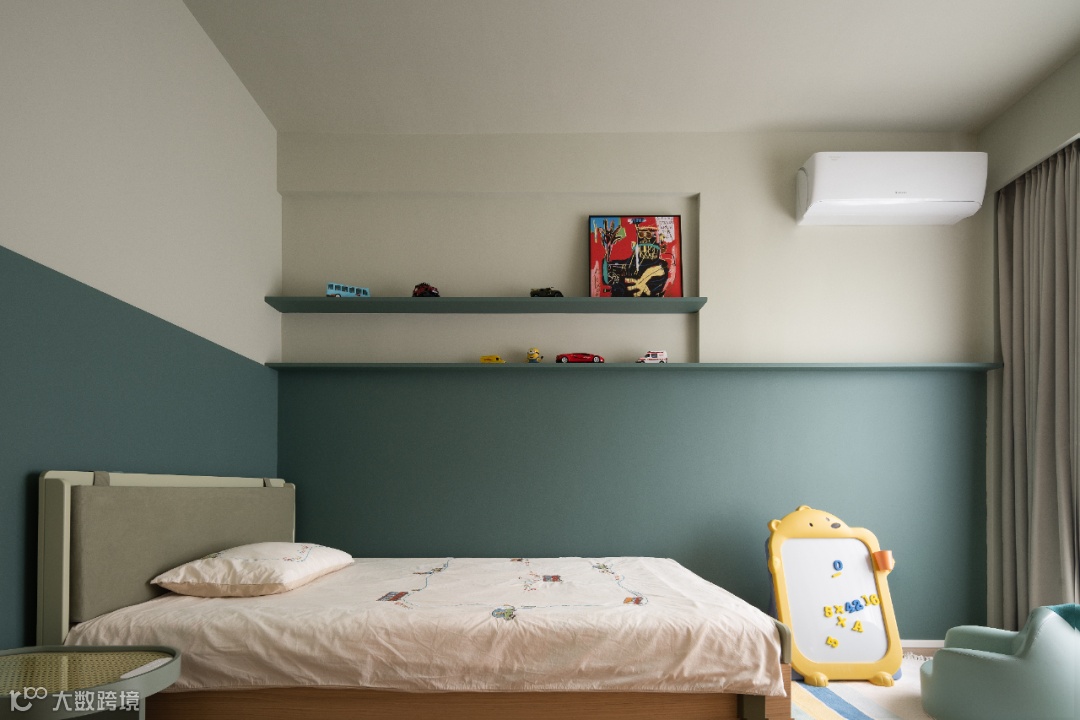 儿童房利用石膏板和有色乳胶漆,营造了小孩的童真趣味,同色系层板,既增加层次感又多了些实用性。