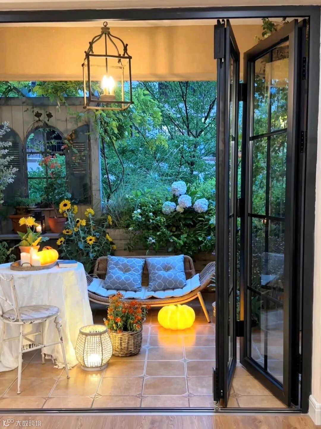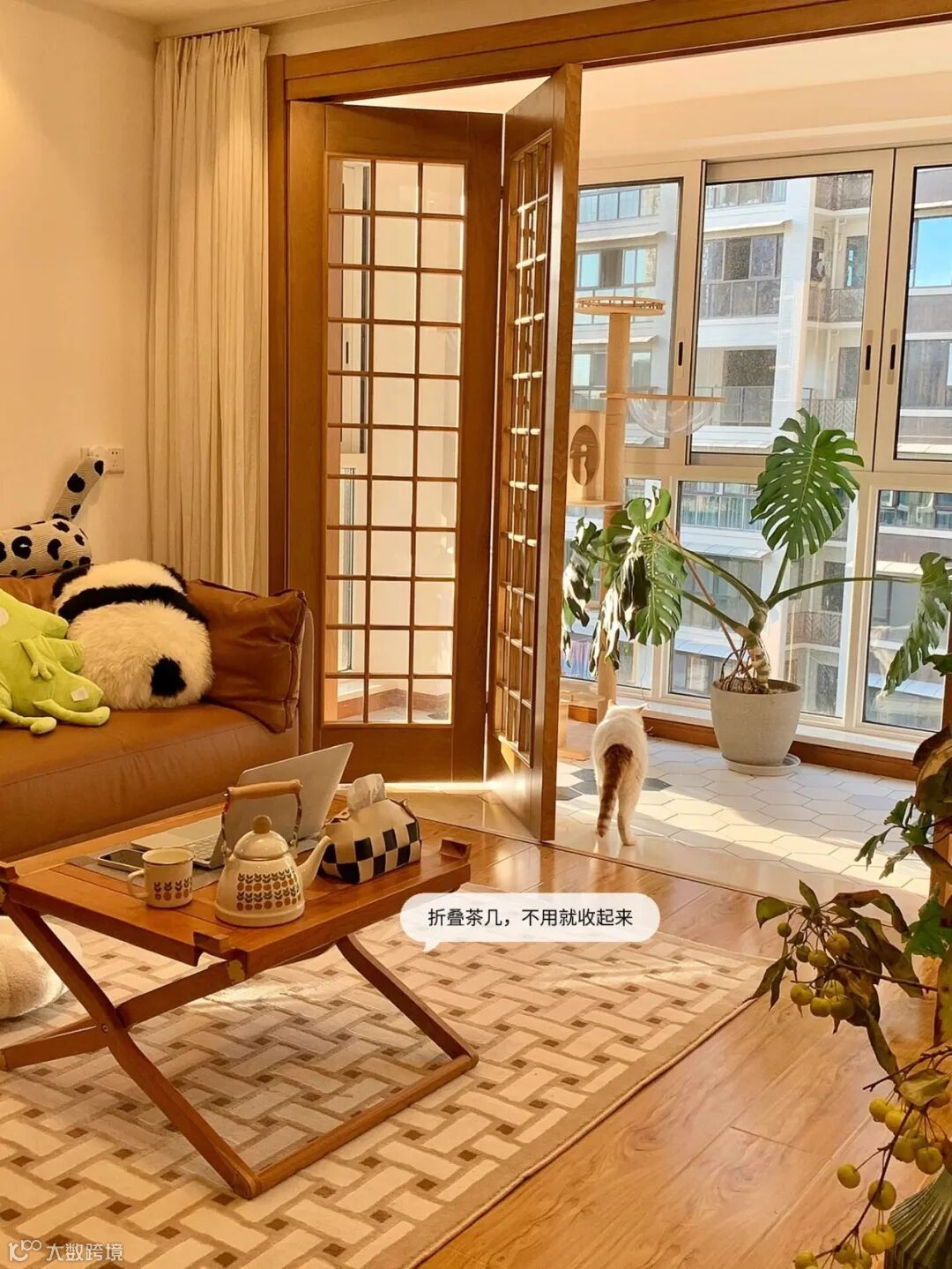 与推拉门设计相比,折叠门更能模糊室内外的界限,扩大客厅空间,让空间隔而不断,使用起来也非常方便~~