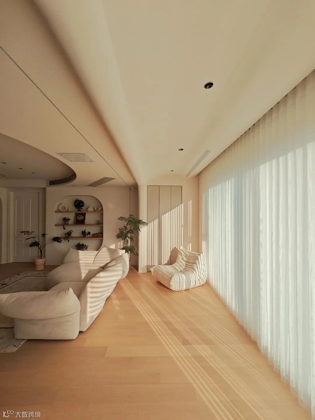 一体化设计的好处是显而易见的。它既可以让空间功能得到延伸,也能大大优化采光、通风与居住者的视野,让室内光线变得更加通透柔和,体验一种“豪宅”的即视感。